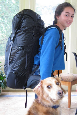 I purchased a new 50L backpack for my upcoming backcountry hiking adventure with Jeanine. Maya is happy to model it for me despite the 40-pound load. Maya is no stranger to backpacking, having completed an 11-mile hike with a 10-pound load while attending Farm & Wilderness summer camp. She will be loaning her pack to Jeanine for the trip who will be carrying 30 pounds.