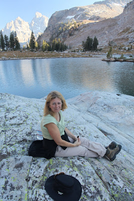 When we reached Lake Solitude at 5 PM we had it to ourselves and Jeanine now adopts its proper name. Without a tripod, we had to settle for pictures of each other but the evening light could not have been more beautiful. The day’s considerable efforts have all been worth the beauty and serenity of this destination. We sat back, had a light snack and just took it all in.