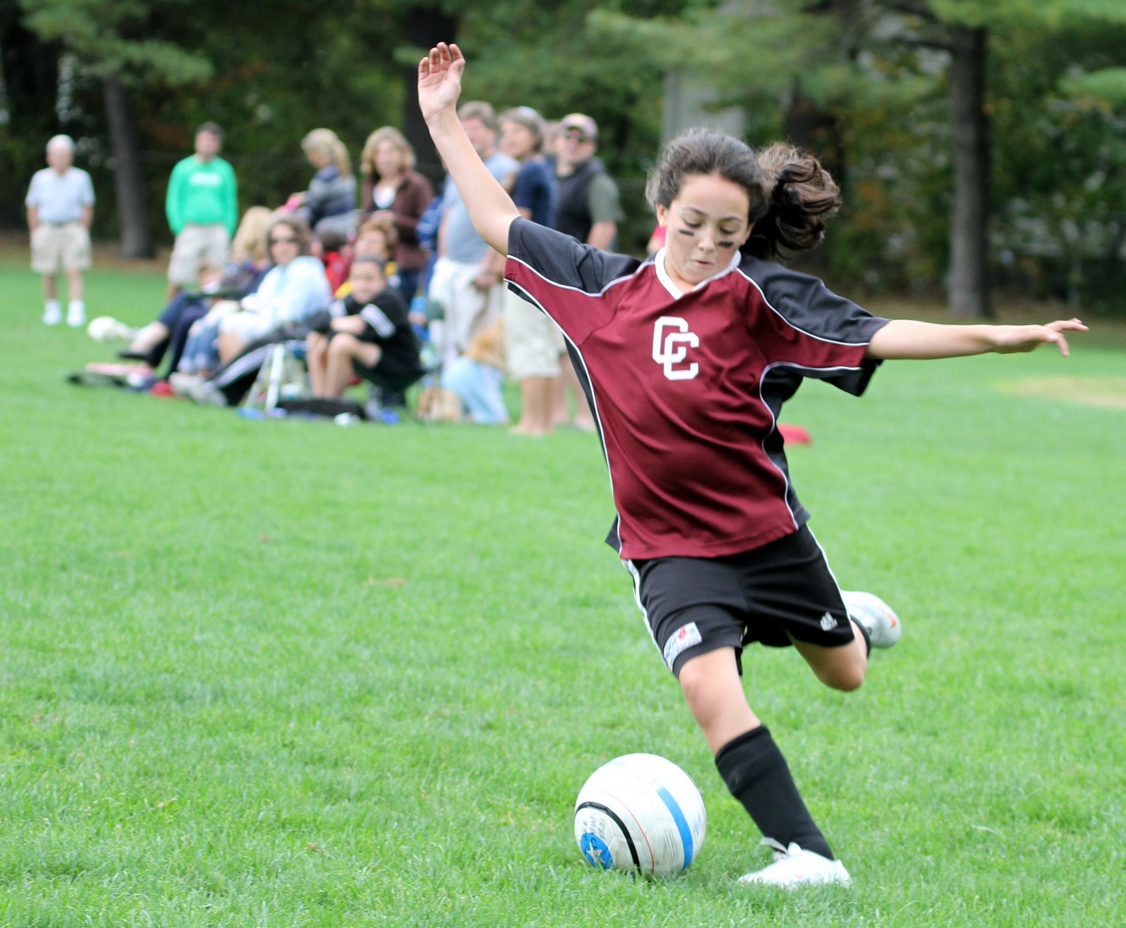 Maya demonstrated very nice form on a cross to the center. Today, she played in both a front line and midfield position rather than her normal spot on defense. She made several nice attacking runs and had two strong shots on goal. Her team had to come from behind to settle for a 1-1 tie in a very competitive match.