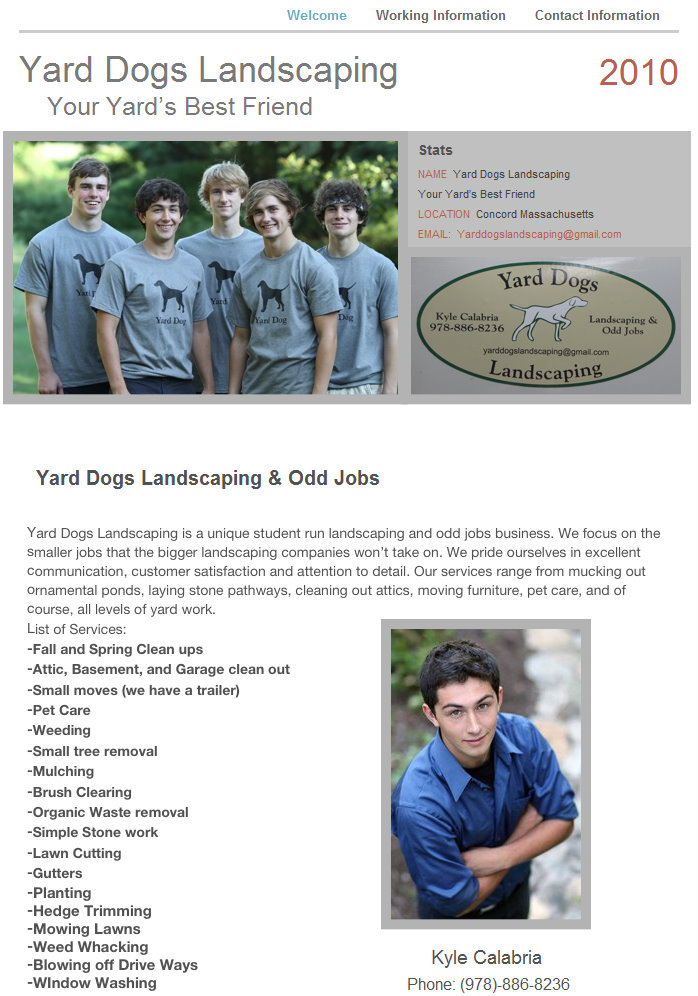 Kyle is busy with college research and preparation but still finds time to develop his business. He contracted with his brother to develop a website which is now online. The site can be reached by following this link (Yard Dogs Landscaping).