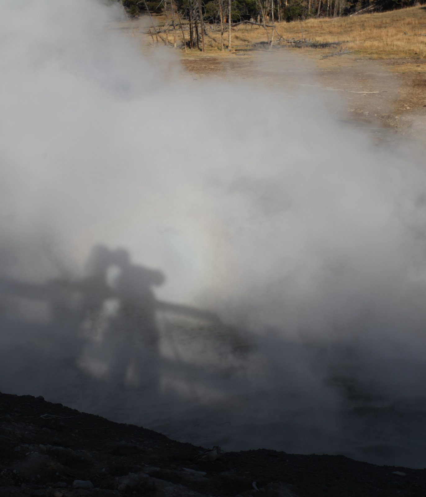 Our final destination for the day is a return to the Grand Prismatic Spring. This time we hike in from the back side for access to a higher vantage point. What I thought would be a quick 10 minute hike up a small hill turned into a one hour major climbing adventure that lasted for an hour. From the top of the easy hill I could see a higher peak with an even better view. Twenty minutes later from that summit I could see an even higher and more advantageous peak. Using my tripod as a walking stick and mustering every bit of strength I had left, I was able to reach what I feel is the ultimate location from which to photograph this spring. As I post this image, I think to myself that it was worth every ounce of effort. Jeanine, who was worrying about me while awaiting my return at the bottom, may have a different perspective.