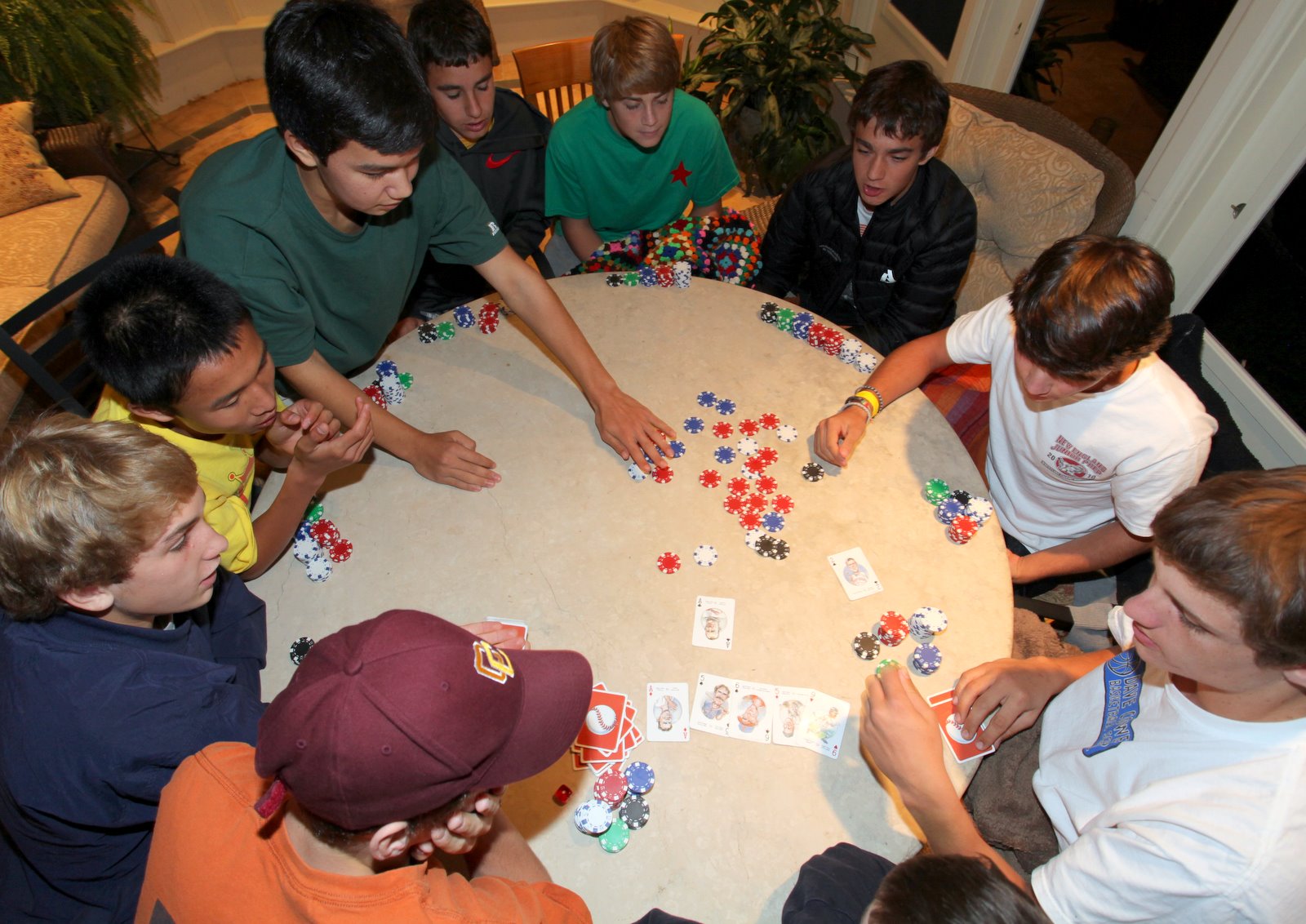 When Jeanine envisioned a sun porch where she could relax and enjoy dining as a family during the summer months, I doubt she could have imagined how much the boys would make use of the space. Nicolai organized a poker party this evening that included a healthy meal of pizza, soda, chips, and ice cream (his guests all chipped in for food). Although I am not a big fan of gambling, I must say that hosting a bunch of teenage boys on a Saturday night for an alcohol and drug-free activity during which they enjoyed howl-out-loud fun is something I can support.