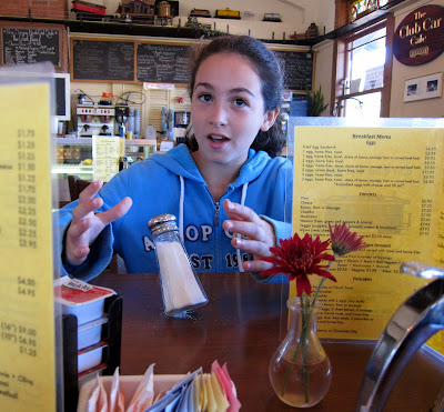 With Kyle in Washington, DC checking out colleges, Maya was invited to take his place joining Nicolai and me for our traditional weekend boy’s breakfast. She ordered a three-egg bacon omelet, breakfast potatoes, toast, and a hot chocolate demonstrating that she was in the same gastronomic league as her brothers. She also entertained us with her salt shaker balancing skills.
