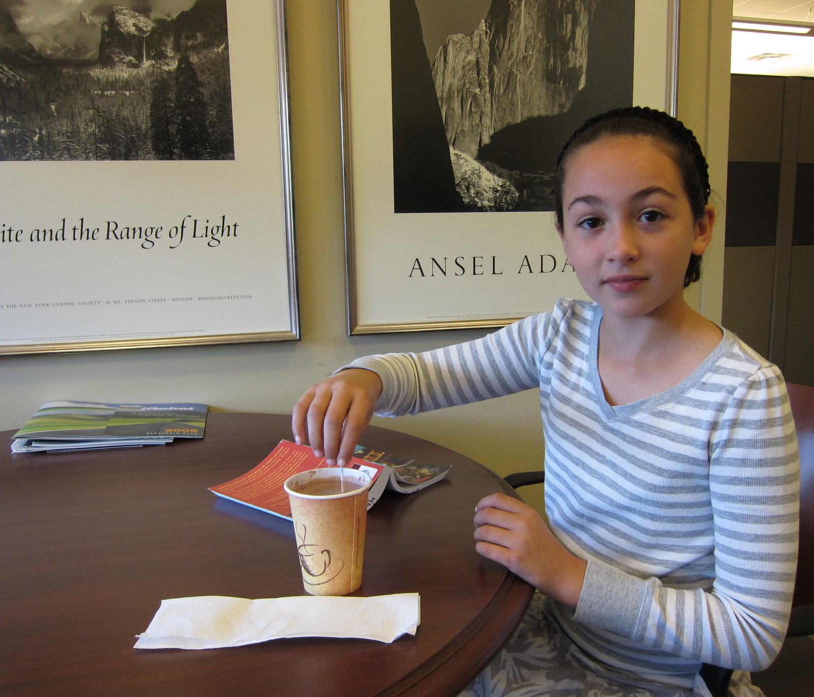 Maya spent the better part of the day at work with me today. There is no school in observance of the Columbus Day holiday and Jeanine will not be returning from Washington, D.C. until later this evening. She is content to do her homework reading assignment, sample the free hot chocolate, and work on one of the available jigsaw puzzles while I was busy in meetings. She also requested that I show her two of my product concept proposals and proceeded to give me good ideas for improvements on both.