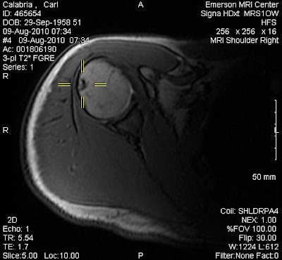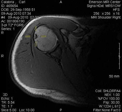 On the way home from work I stopped by the hospital to pick up the MRI study (comes on a CD) of my right shoulder. I have an appointment tomorrow with an orthopedist to determine the next steps. It has been almost a year since I injured myself playing goalie and my shoulder shows no signs of improvement. I launched the viewer program and read the radiologist’s notes which referenced the image above. The dark area between the yellow crosshairs is not supposed to be there.