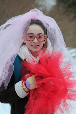 Maya decided to create a Valentine’s Day outfit for school today. Apparently, it was very effective because she received a necklace from a secret admirer and many cards. Jeanine treated the family to a lovely dinner including heart-shaped tarts that were out of this world. I sent roses to my favorite author and she reciprocated with a gift for me to be worn by her. No photo will be provided.