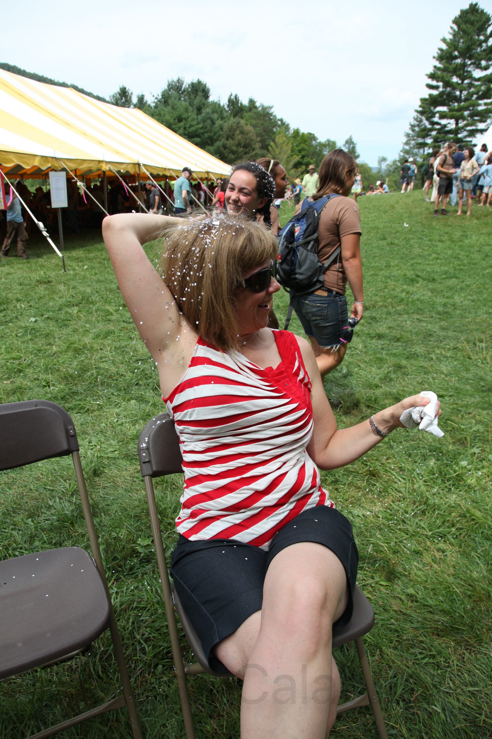 The day is structured around a fair which starts at noon and goes until dusk featuring many fun activities (water flume, hand build Ferris wheel, zip line, pie throwing, music, food, and arts and crafts. A camp tradition involves cracking a confetti filled egg over the head of your parents and friends. Jeanine gave as good as she got.