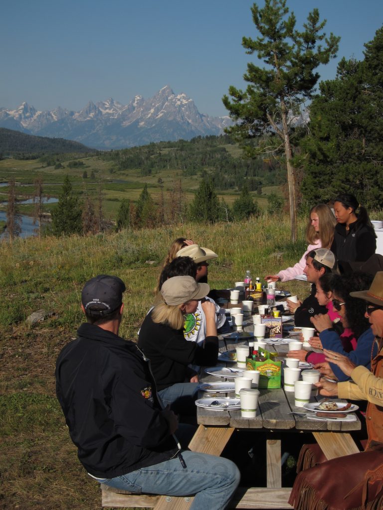 The family was up early this morning for a trail ride to breakfast alfresco overlooking the Teton range. Our horses spend each evening in a huge pasture and the wranglers coral them each day. This mother and foal have their own special pasture where they spend all day grazing and nursing.