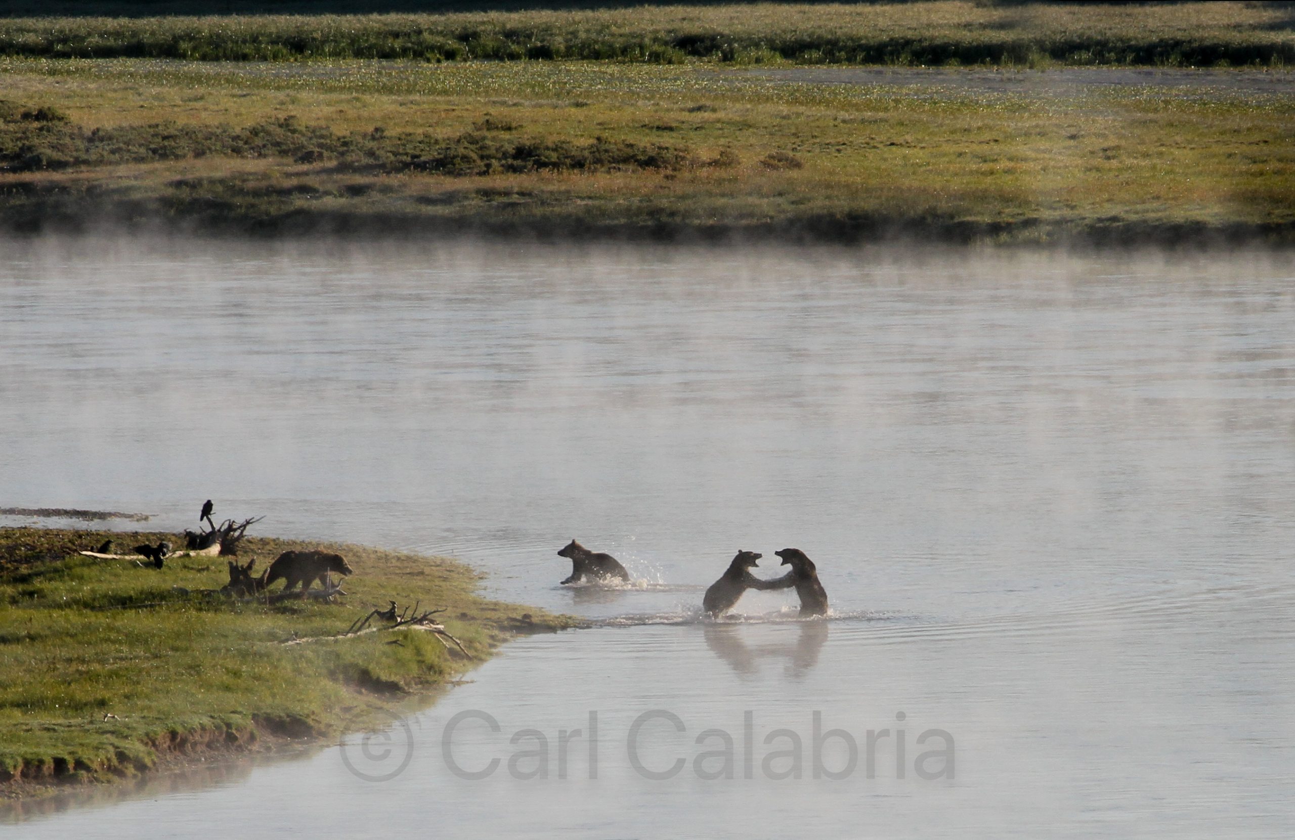 The family departs shortly after sunrise for Hayden Valley where we hope to encounter wildlife. Our timing could not have been better. With steam still rising off of the Yellowstone River we spot four Grizzly bears fighting over a bison carcass in the water. I have a full series of the brawl in which the strongest bear establishes his dominance and sole rights to gorge himself on the bison before the 2nd place bear takes his turn. Between my long lens, our spotting scope and binoculars we all enjoy a front row seat to the amazing spectacle.