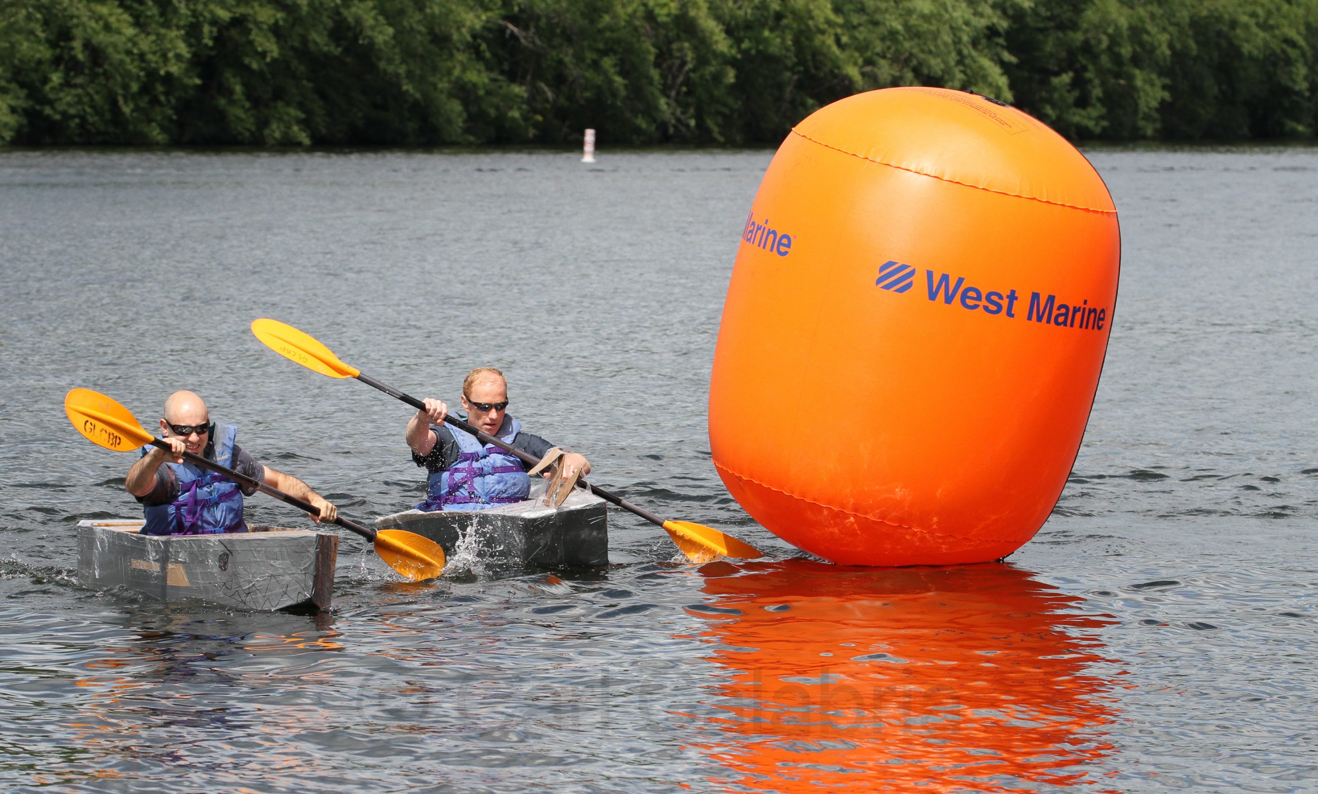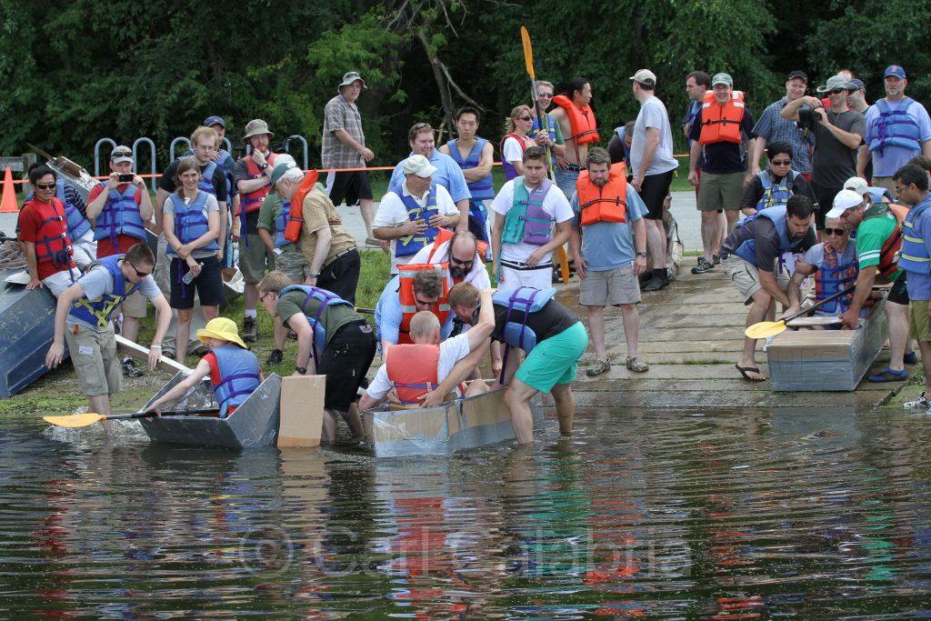 There are few things I enjoy more at work than designing team building events. I have done close to a dozen over my career and today’s was one of the best for sure. The challenge involved building boats out of cardboard and duct tape and then racing them to determine a grand champion. The rules governing the competition were designed to focus the teams on designing for durability and robustness (characteristics we are seeking to improve in our products). The winning boat would have to complete, in the least time, a total a six 100 yard laps with six different paddlers in head to head rowing. The weather could not have been more perfect and the Abe Bashara Boathouse in Lowell proved the perfect venue. Construction of nine boats took the entire morning with racing and debriefing occupying the balance of the day. More than half the boats finished all six laps with at least one photo finish and a few highly entertaining capsizes.