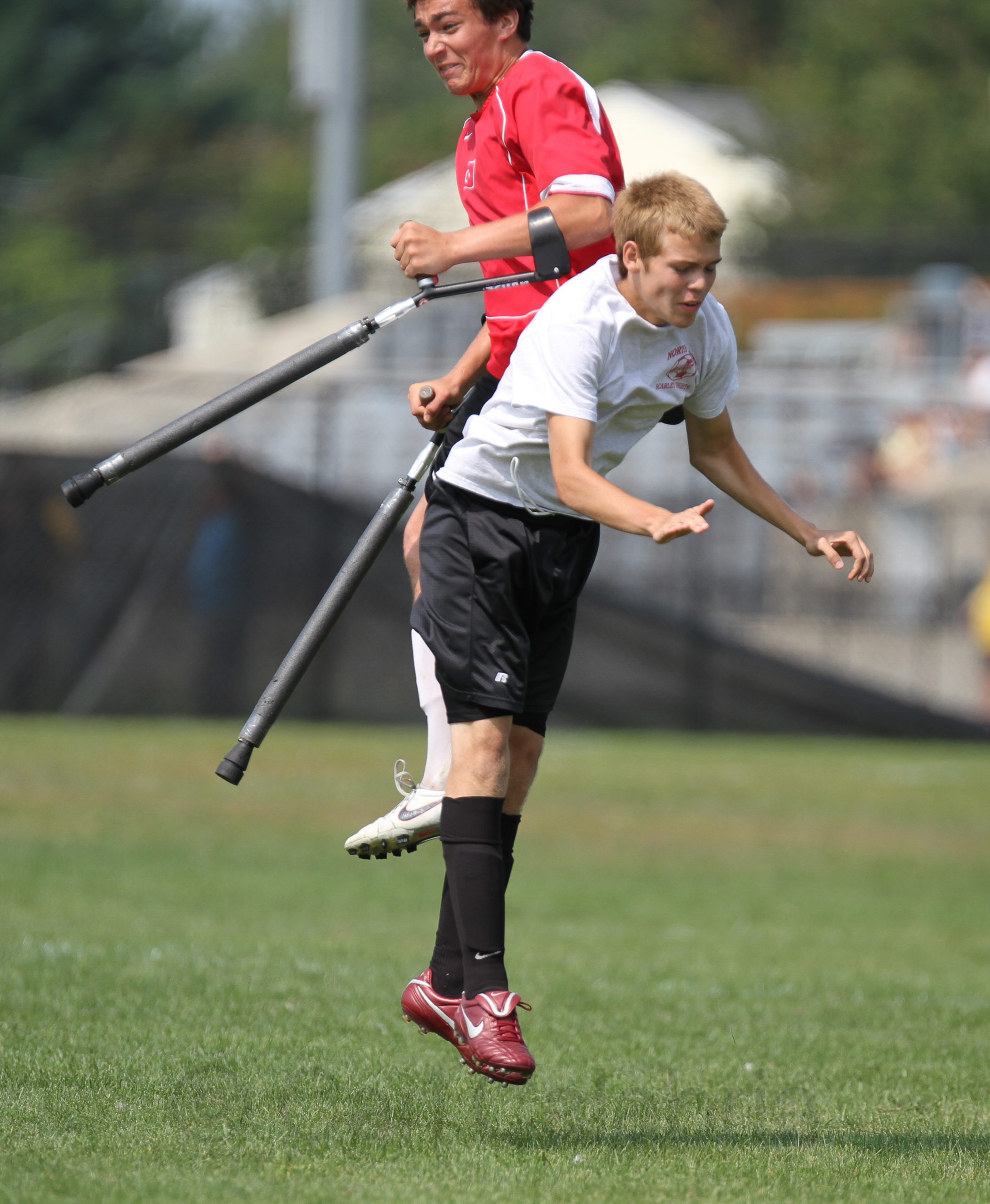 With soccer season in full swing Nico is putting maximum stress on his crutches. Over the weekend one of his crutches had a total failure. Today the second one had the exact same failure. The aluminum insert to which the upper end of the carbon fiber tube connects appears to have suffered a material fatigue failure. We spoke with Kerith at SideStix this evening and will be returning the broken parts for failure analysis. Meanwhile Nico will use his backup crutches which are of a slightly different design. Nico had an assist on his team’s first goal before he was forced to sit for the rest of the game. Nico continues to be the most aggressive field tester that SideStix has and they are committed to make their products “Nico proof”. We can literally point to a half dozen major design improvements that address prior Nico induced failures.