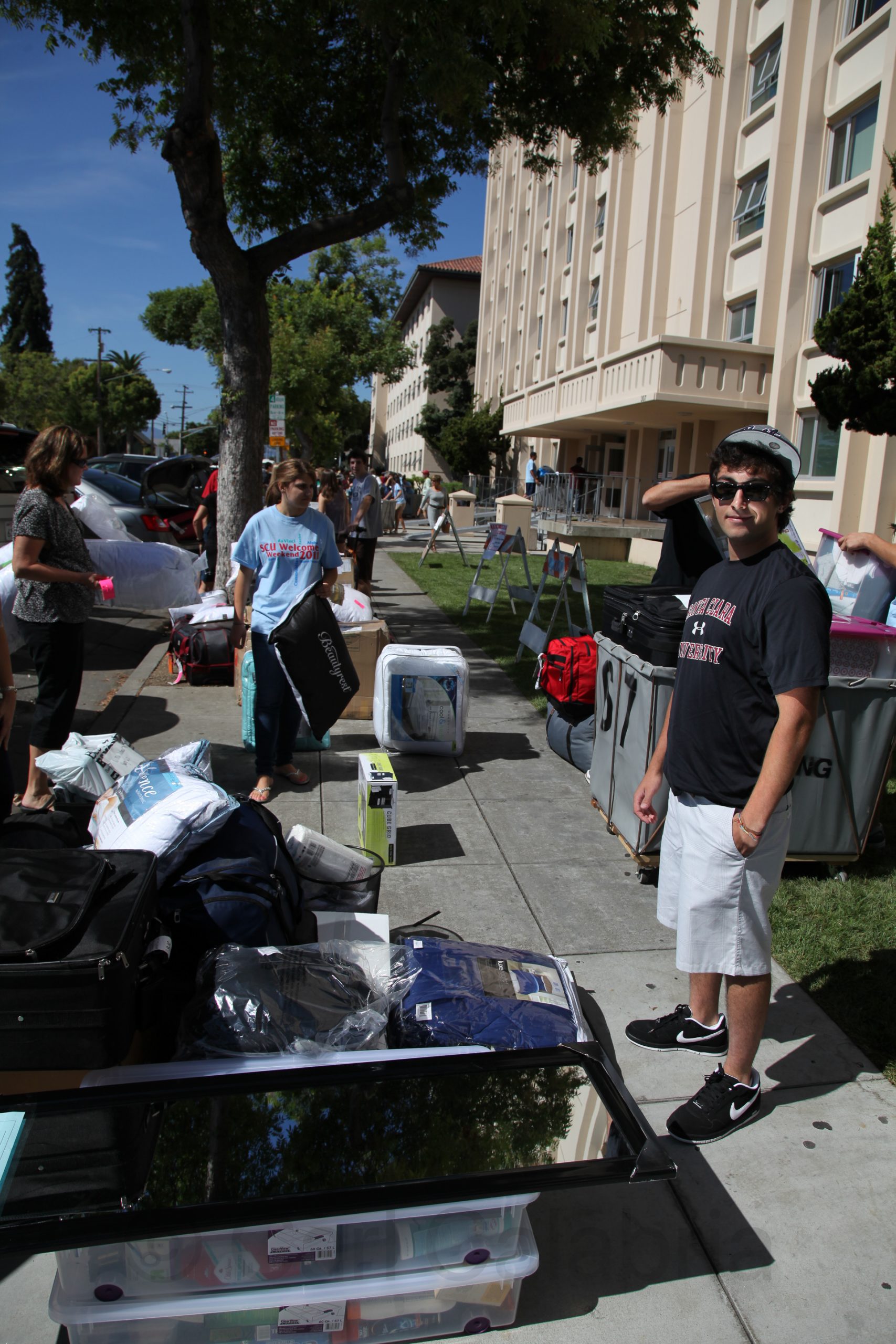 Our move in time was scheduled for 10:30am at which time we entered a well organized queue of cars which pulled up to the dorm, Swig in our case, and discharged passengers and belongings on the curb. Huge containers on wheels were provided into which all items were loaded for the elevator ride to the seventh floor where Kyle will share a room with Tyler from Seattle. With the three of us working in concert we had Kyle situated and organized in his dorm room in no time flat. He selected the bed adjacent to the window which overlooks the Santa Cruz foothills and gives him a good overview of the party scene at the off campus housing below.