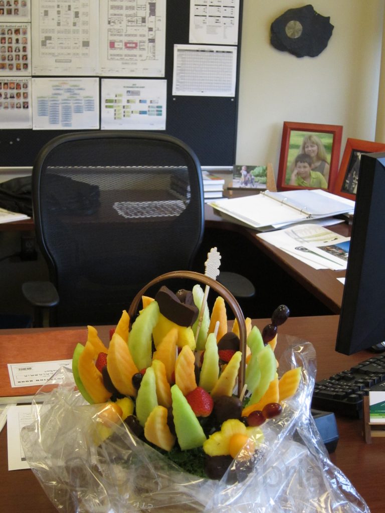 I received this fruit bouquet and a nice card from my colleagues at work today. We have postponed our family celebration until Friday because I have soccer practice this evening (mustn’t lose sight of priorities).