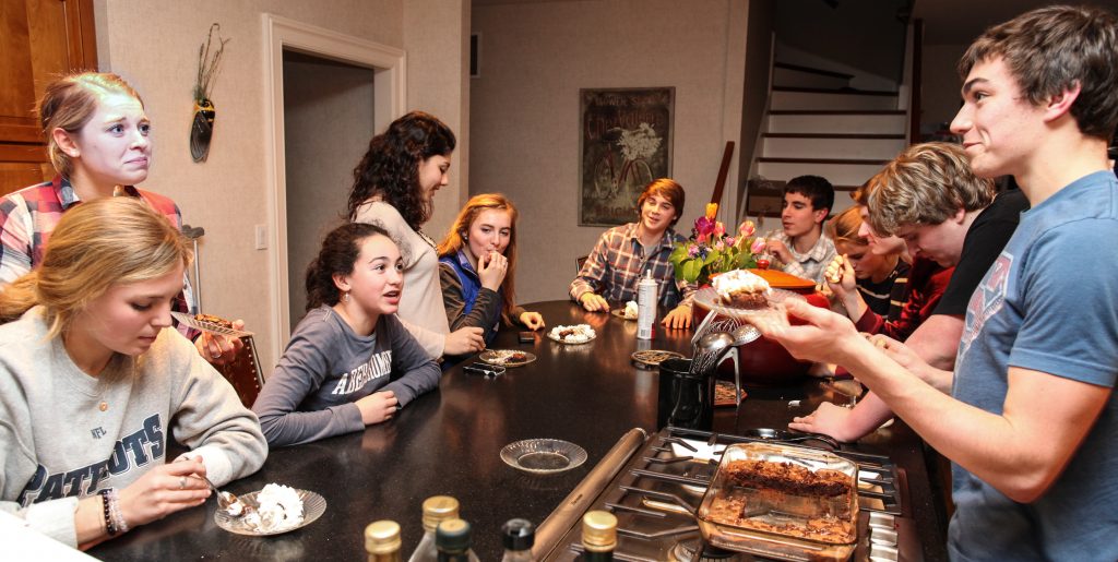 As New England families go, we are not remotely what you would call professional sports fans. We tend to participate rather than watch others play. That said, the Super Bowl is a special event. One to be appreciated as much for the over the top coverage as the inventive commercials. Nicolai took advantage of the occasion to have a party in the basement where his friends enjoyed watching the game on the 12 foot screen in our home theater. I captured the group when they came up to enjoy Jeanine’s freshly baked brownies during halftime.