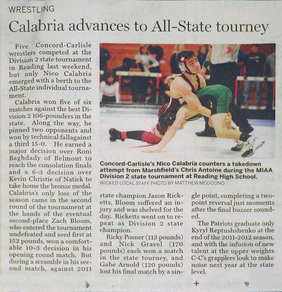 This week’s Concord Journal just arrived with a nice story covering last weekend’s D2 State Wrestling Tournament in which Nicolai is pictured on the front page of the sports section. This will be the last such coverage this year as Nico has decided not to wrestle at All-States. Making weight has been a struggle all season and not something he wanted to extend for another 2 weeks. He is already back to his nominal weight of 125 pounds, a far stretch from his 106 pound weight class. Even more of a factor in his decision, however, was the fact that he was the only member of his team to qualify. As such he would have to train at distant Winchester High School every day with wrestlers from other teams. For Nicolai, wrestling has always been as much about camaraderie as it has been about the sport. We can only respect his decision and look forward to next season when we hope he will select a less ambitious weight class to compete at. He concludes this year’s season with a 19-1 record (13 by pin, 3 by tech fall, 3 by decision), outstanding wrestler honors and 1st place finish at sectionals, and third place at the D2 State Tournament.