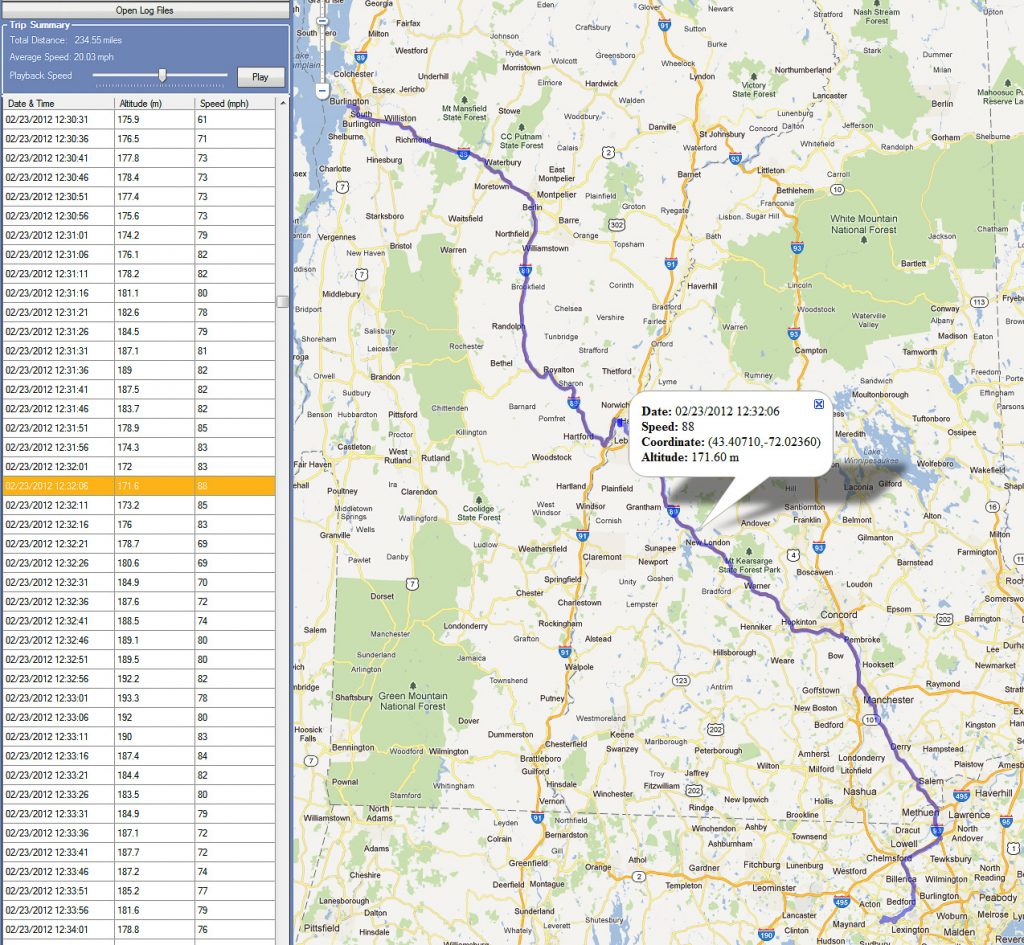 Nico and a friend left this morning in Jeanine’s car on a two day college tour to include Dartmouth, UVM and an overnight stay with his Aunt Susan in Burlington. With only four more months until he turns 18 I did not want Nicolai to wind up with a speeding ticket like his brother did and risk losing his license. Kyle, you may recall, dodged a bullet when the issuing police officer failed to appear at his traffic court hearing and the ticket was nullified. To his great consternation, I insisted that Nico bring my GPS tracker with him for the duration of the trip.This tiny device captures GPS coordinates every 30 seconds and shows route and speed on a map after the data has been downloaded. I pointed out to him that I could have easily placed this in the car without his knowledge and that I was being open with him about my intent and expectations. This did little to diminish his displeasure with my “request”. A review of the log after the journey confirmed he was in the right places at the right times and that he generally traveled with the speed of traffic although I am still questioning a 2 minute “passing” maneuver with speeds above 80mph and a peak of 88mph!