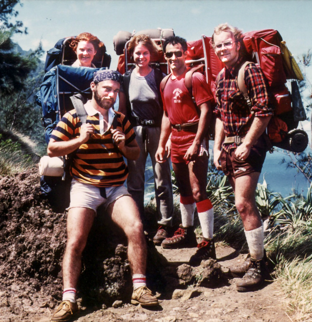 My Stanford roommate, Ken Zabriskie (far right) and his daughter Kate joined us for dinner this evening. He flew out from Indianapolis and will be driving back with her as she relocates from Boston to take on a new job. This photo is from a vacation we took together in Kauai where we chartered a helicopter to drop us off at the far end of the Kalalau trail on the Napali coast. We then spent three days hiking out enjoying the awesome beauty and forging some of my fondest memories from my college years. This trip was my first hiking/camping experience independent of my parents and I believe it is what inspired my life long interest in adventure travel. Kyle has recently indicated that he is considering joining the Santa Clara Outdoor Adventure Club. I plan to send him a full set of top drawer camping gear so that he may comfortably enjoy his excursions into nature. I hope he will develop and one day share my passion for the great outdoors which has been a great source of joy in my life. Ken presented me with the negative of this image taken of me at the far end of the trail as I photographed the surf pounding against the cliffs. My version was good, his, by virtue of the included human silhouette in the foreground, was exceptional. I credit Ken with having kindled my interest in serious photography and it was an truly meaningful gift.