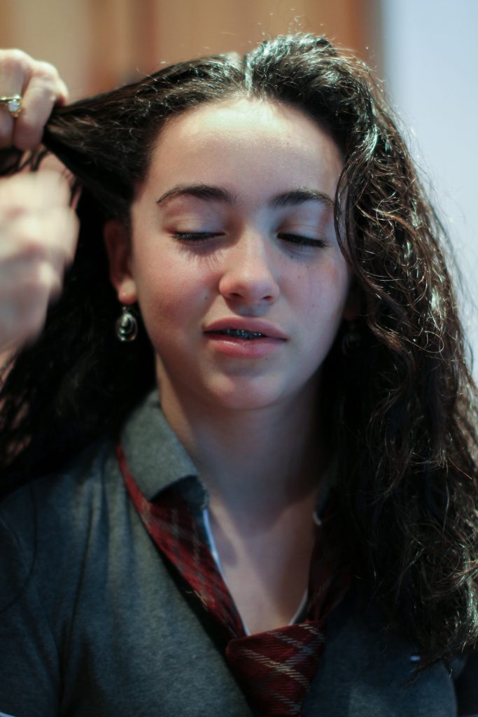 Maya looked elegant in a new dress, hand tailored by her Aunt Marie, as she readied herself to attend a bar mitzva for a school mate.