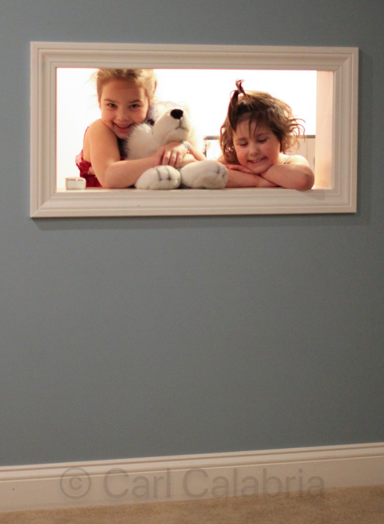 When I returned from work this evening I was treated to a great surprise. My brother Mark was able to join the rest of his family for a weekend visit from Minnesota. Pictured here are my niece Sophia and her sister Rose. When I finished our basement, I built a kids-sized room with a tiny door and window underneath the stairs. I was pleased to see it occupied again as my children have long since outgrown it.
