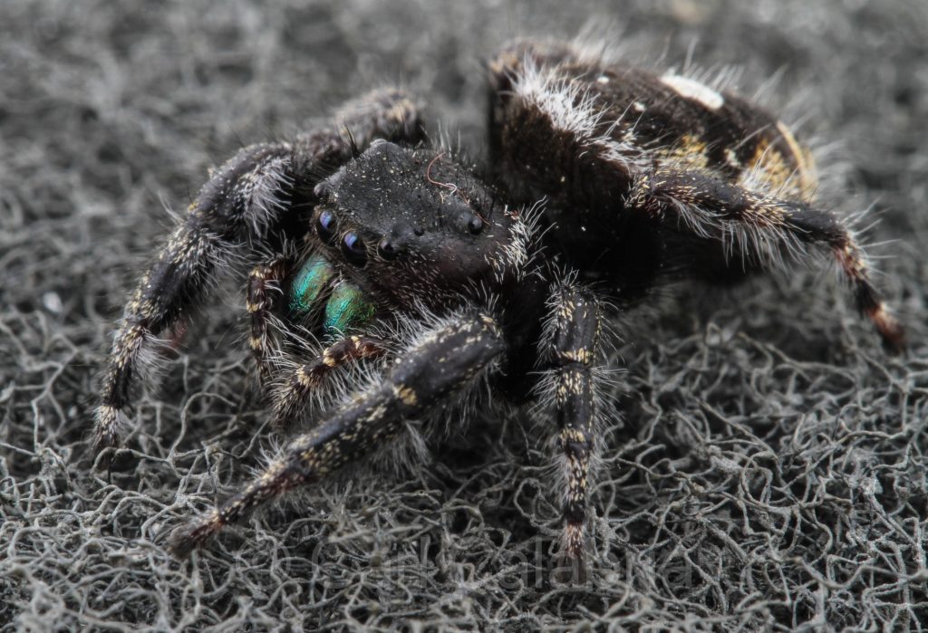 All I am going to say is that this was a very difficult photo to make. I don’t particularly care for spiders and the big white dot on this one’s back warns of its venomous bite. Jumping spiders have a total of 8 eyes and can jump many times their body length. They generally do not spin webs but rather stalk their prey, ambush them with a prolific leap, and use their fangs to inject them with their fast-acting poison. If you can look past all the creepy stuff I think this one, probably a juvenile is rather cute.