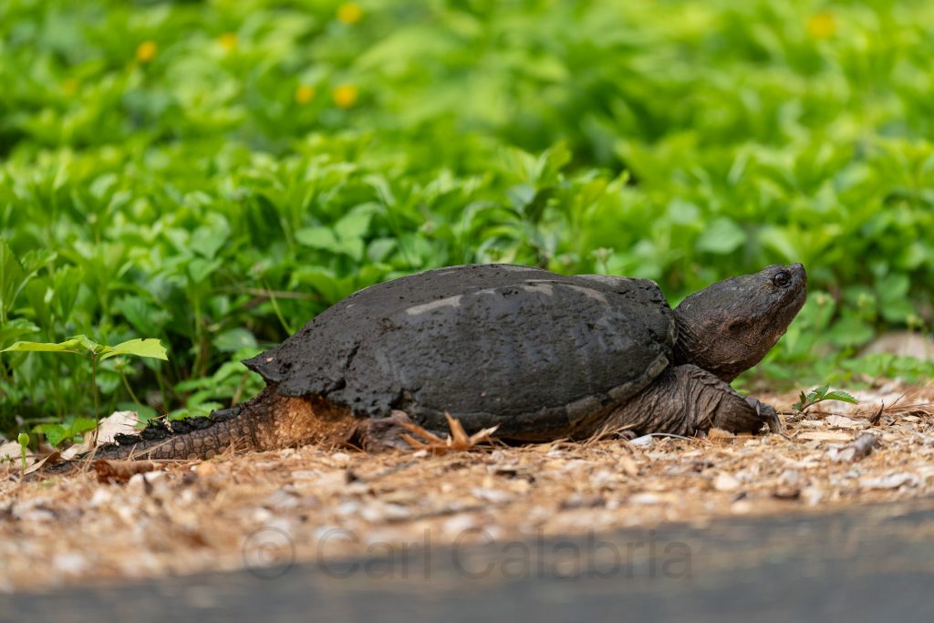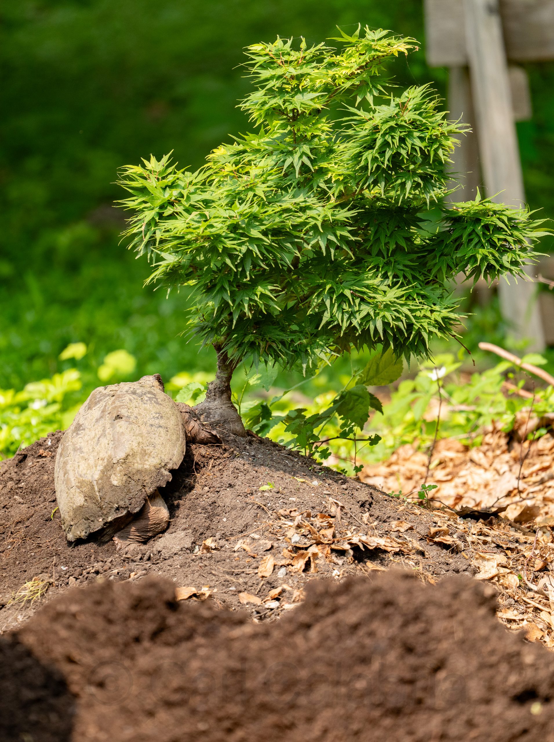 Today, we had an extended visit from a large snapping turtle. I estimate the shell length to be 16 inches. S/he spent several hours moving about the newly mulched areas of our front yard and eventually started excavating the compost pile in which my future bonsai Japanese Lace Leaf Maple is growing. A provoked snapping turtle of this size can easily remove a finger from your hand and can strike with lightning speed over a distance of about six inches. It is best to give them a wide berth. I suspect she was surveying our yard to locate a good place to lay eggs. When the coast is clear, I will investigate the compost pile to see if I find eggs there. If yes, I will cordon off the area until the baby turtles hatch.