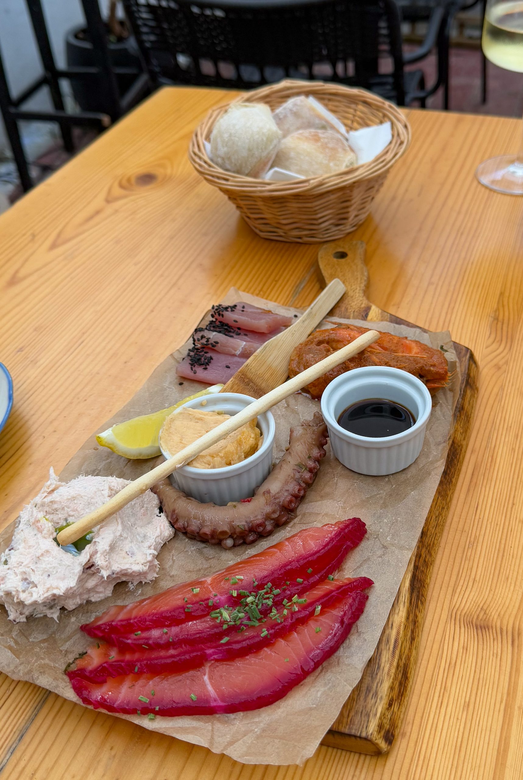 Kyle may have inherited his passion for adventure travel from me, but there is no doubt he acquired his appreciation for exotic fine food from his mother. Presented with the meal below, I would be content to have the bread and the lemon, and possibly the sweet potato if I were feeling particularly venturesome.