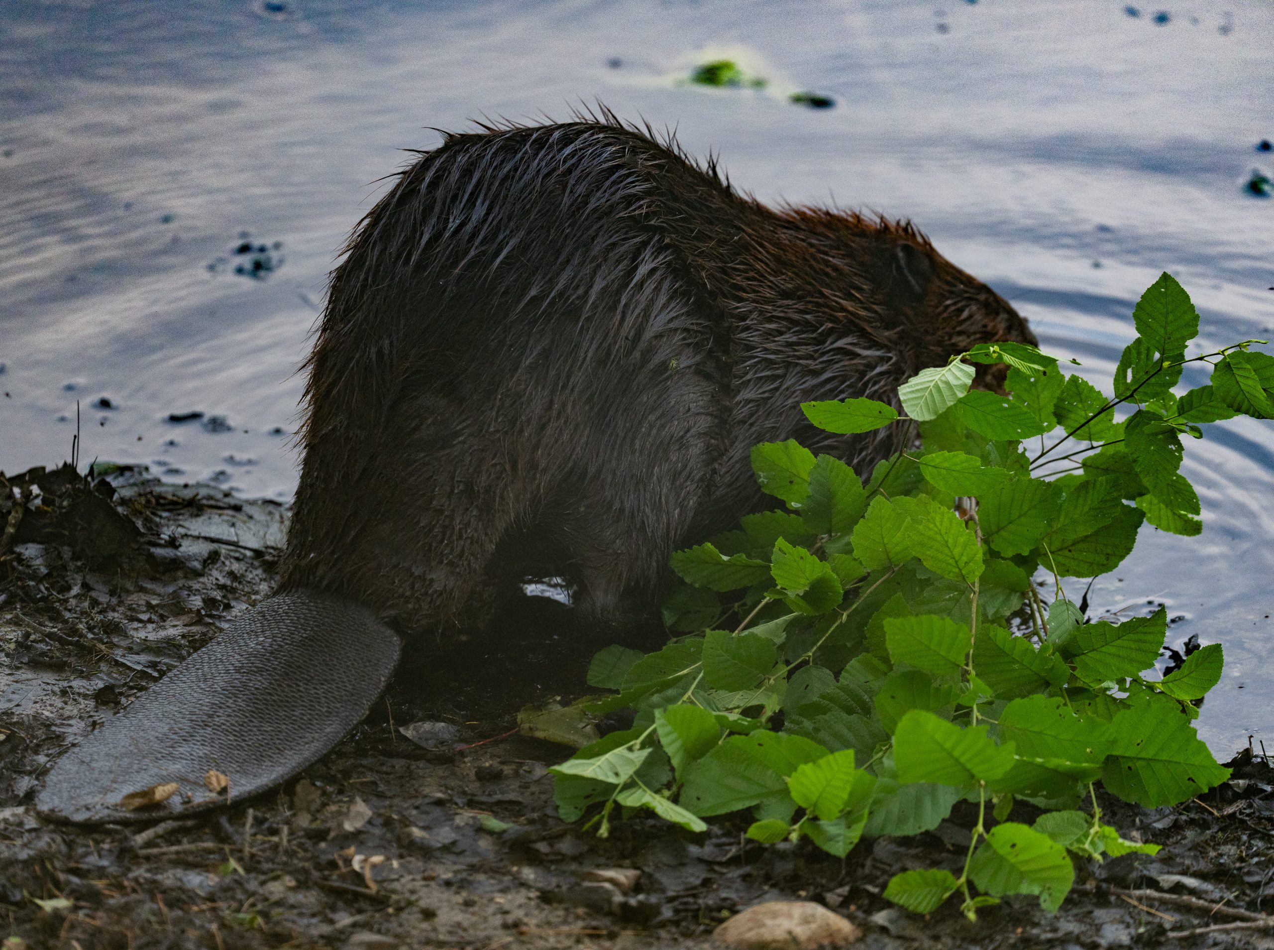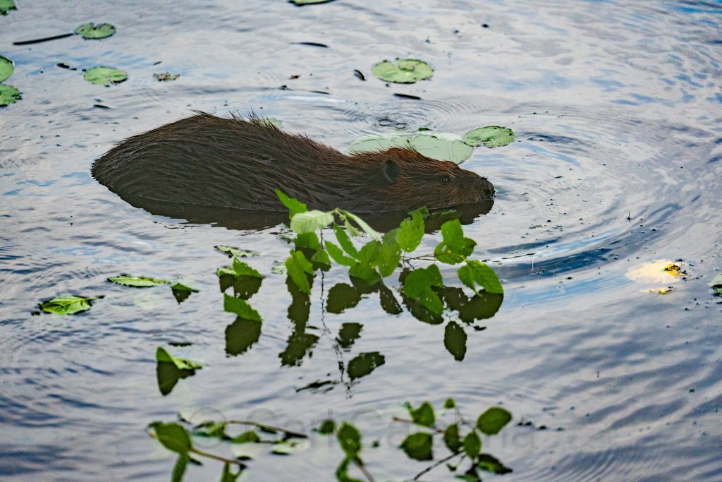 Our local beavers appear to be starting construction on a new lodge. This evening, this rather large one came ashore directly in front of our house, cut down a small sapling, and took off upstream. The photos are not very good because (a) it was dusk, and (b) the lens on my camera fogged up when I took it from our air-conditioned house out to the patio where the humidity was very high.