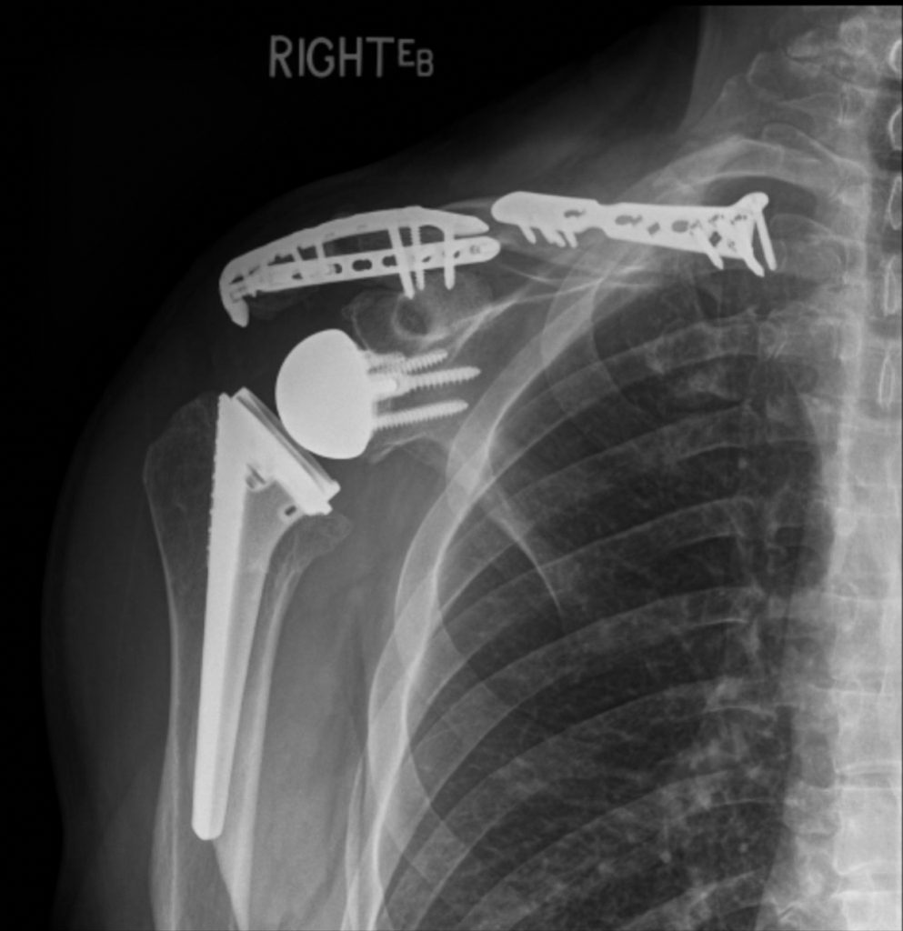We were surprised to find Tom in an arm sling when he greeted us. Tom is a very strong guy, but not that smart. While riding his bike along a 3-lane highway at 24 mph, he thought he would push the minivan that cut in front of him out of his way by lowering his shoulder and ramming it. The x-ray above illustrates who won that matchup.