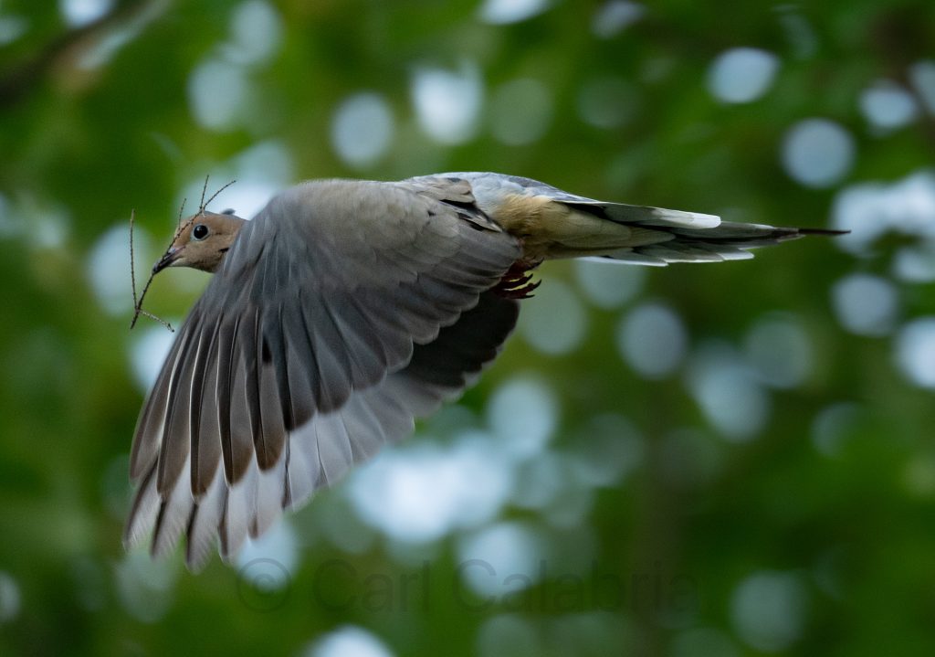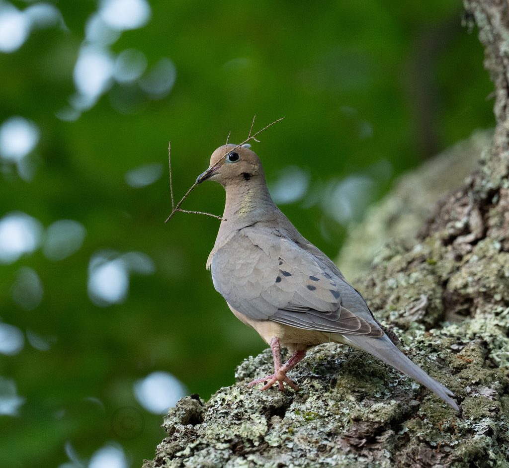 Jeanine and I had dinner on the patio this evening while being entertained by a mourning dove in the process of building a nest. (S)he made dozens of trips from the forest floor to the nest, transporting a small twig with each flight. Perhaps we will have baby doves featured in a future post.
