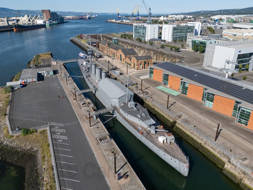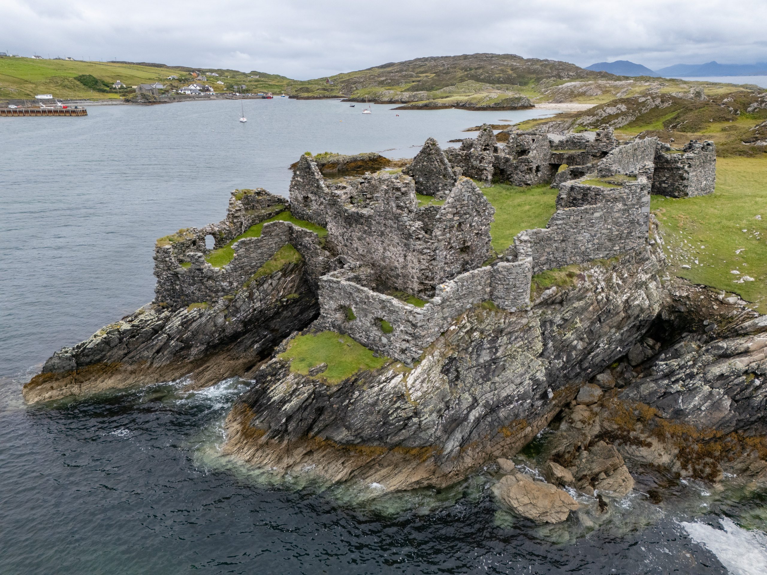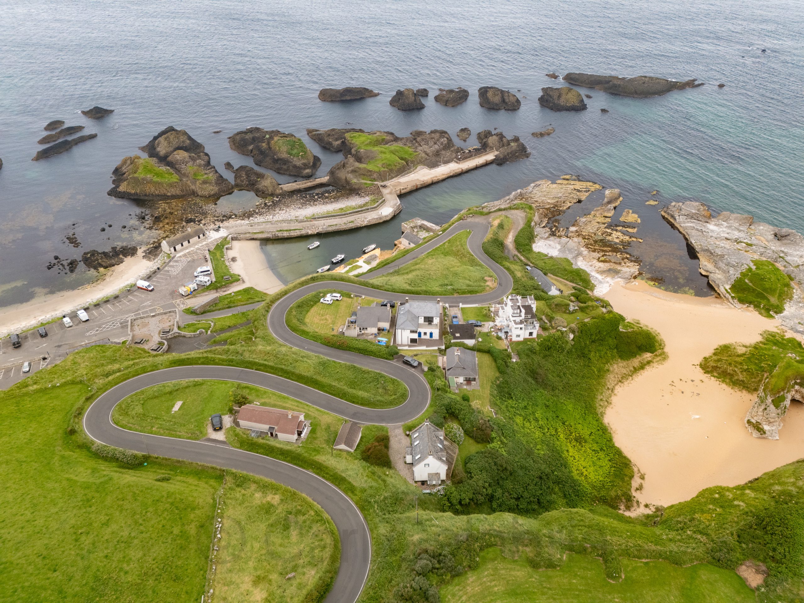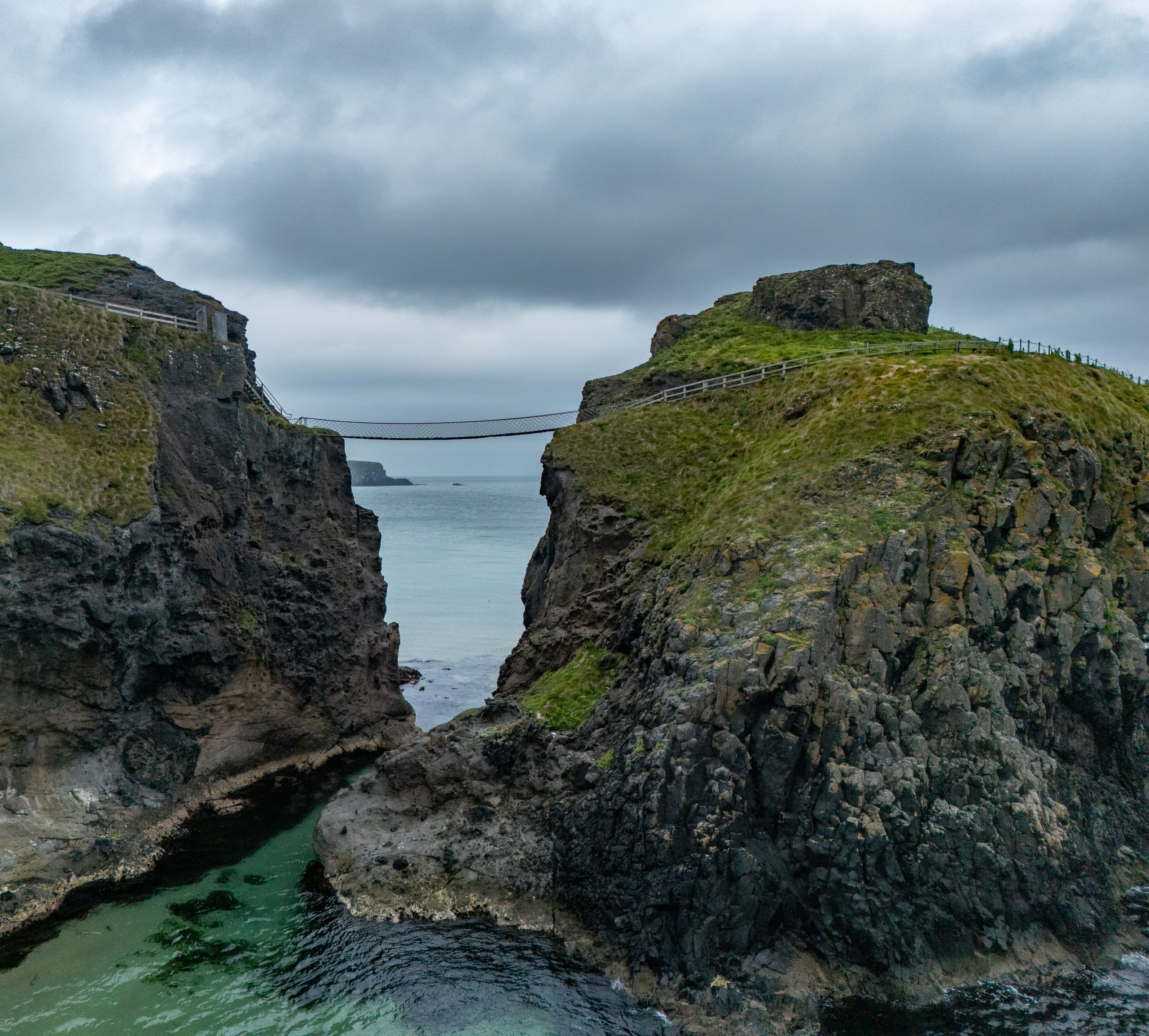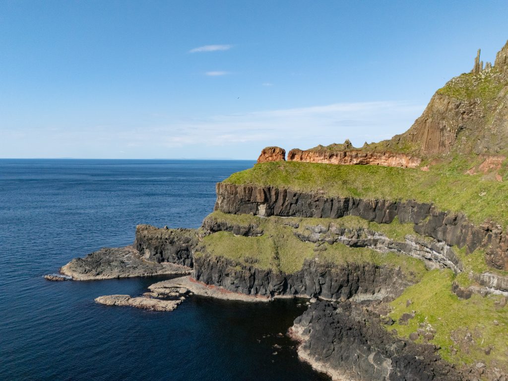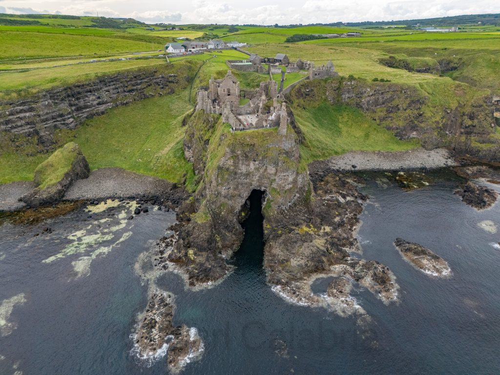 Today, the crew covered a lot of ground, stopping frequently to take in the sights of Ireland’s northern coast. Pictured above is Carrick-a-Rede, originally constructed to provide salmon fishermen with safer and easier access to Carrickarede Island for netting Atlantic salmon, reducing their reliance on boats to reach the best fishing spots. Below, is an aerial view of Ballintoy Harbour where we paused to stretch our legs and take a group photo.