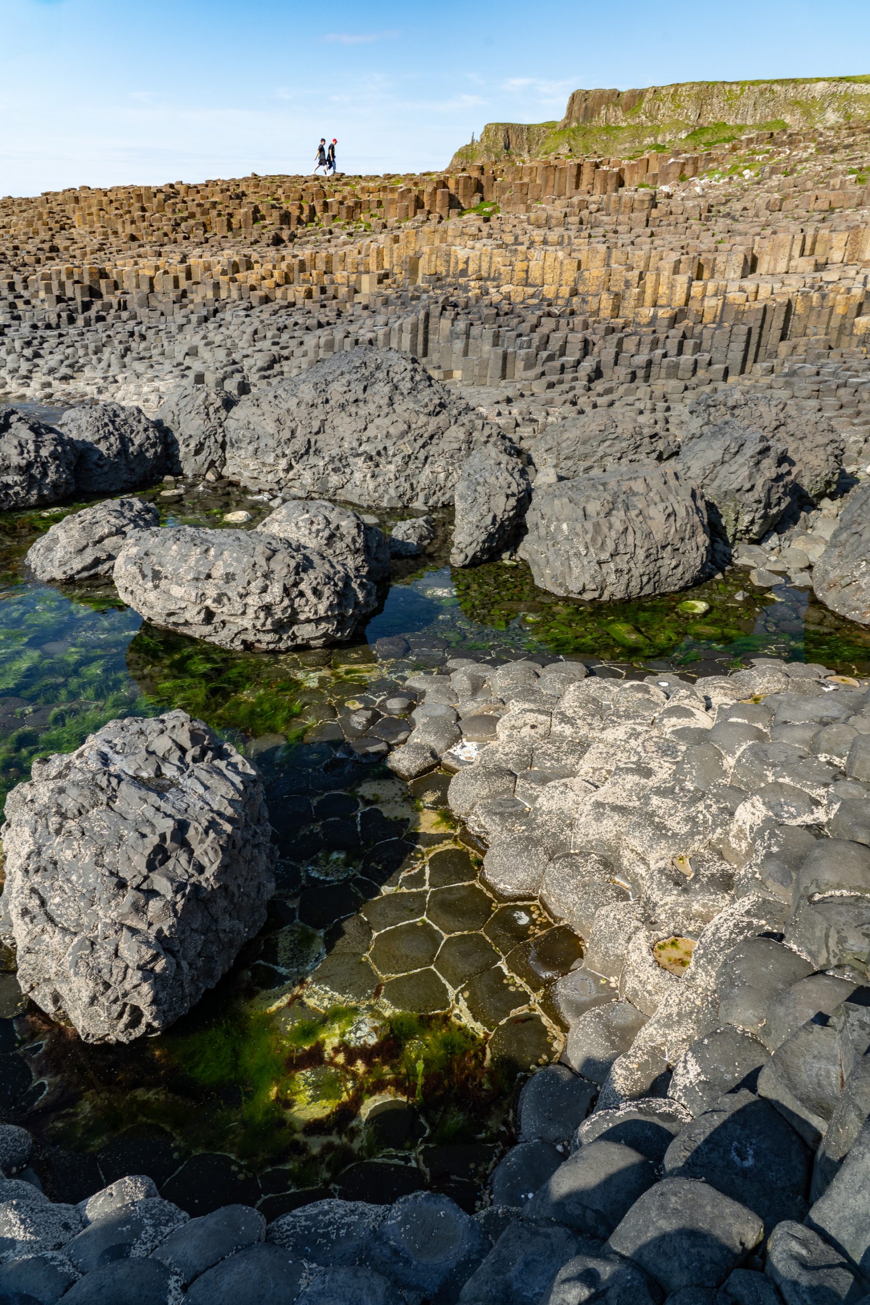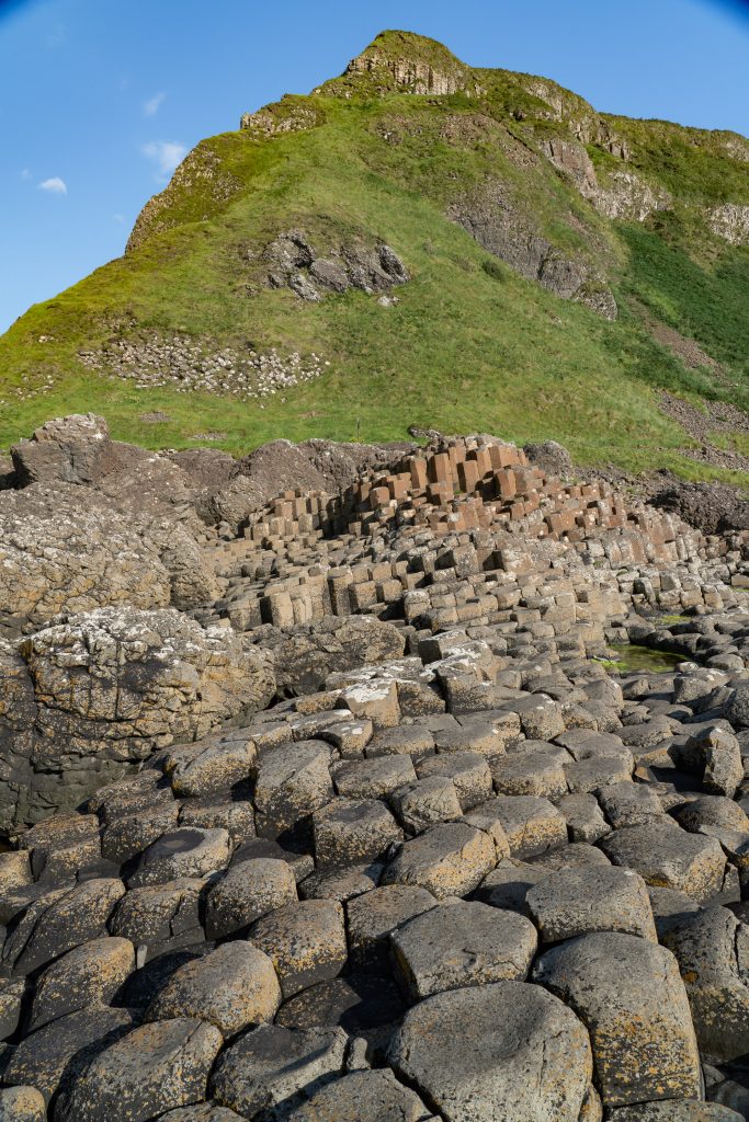 This morning, our crew (Mark, Marie, Jeanine, and I) joined a guided walking tour of Belfast focused on “The Troubles.” It was highly educational but not exactly visually stimulating. The opposite can be said of the Giant’s Causeway, which is a photographer’s dream. I separated from the group that joined a tour, so I could explore on my own. I racked up 7 miles and hundreds of photos. The Giant’s Causeway was formed about 50 to 60 million yearsago when intense volcanic activity caused molten basalt to pour through fissures in the Earth’s surface. As the lava pools cooled slowly and evenly, they contracted, leading to extensive cracking that produced around 40,000 polygonal basalt columns—most famously hexagonal in shape. The distinctive appearance of the columns is the result of this regular fracturing during the cooling process.