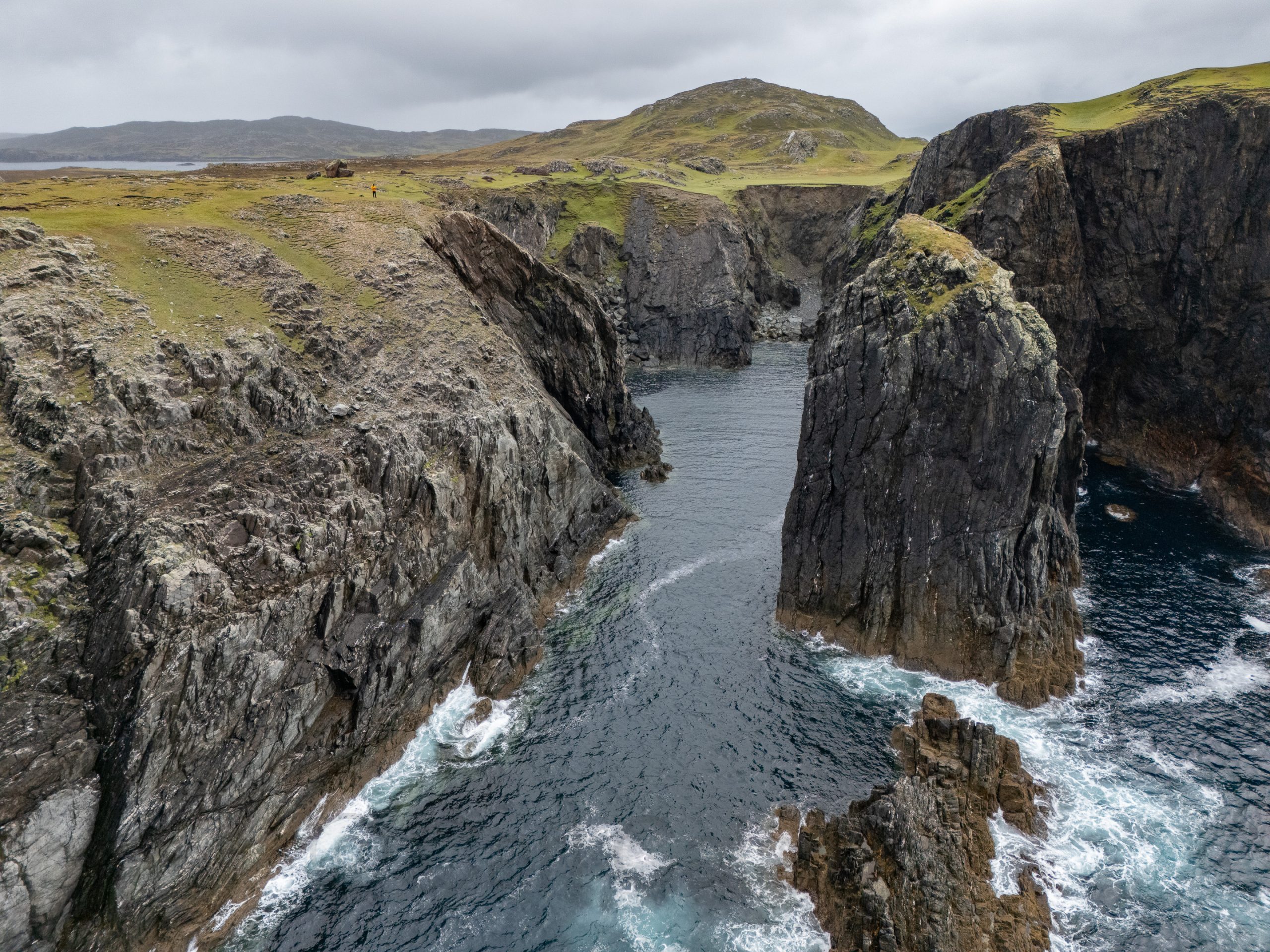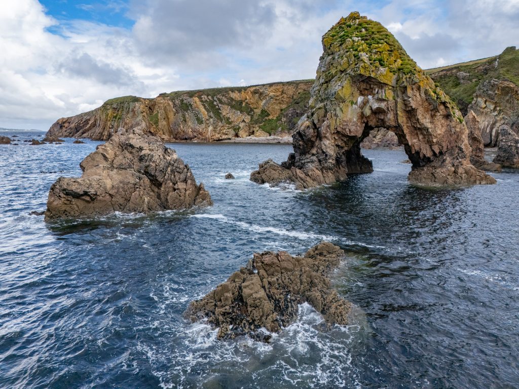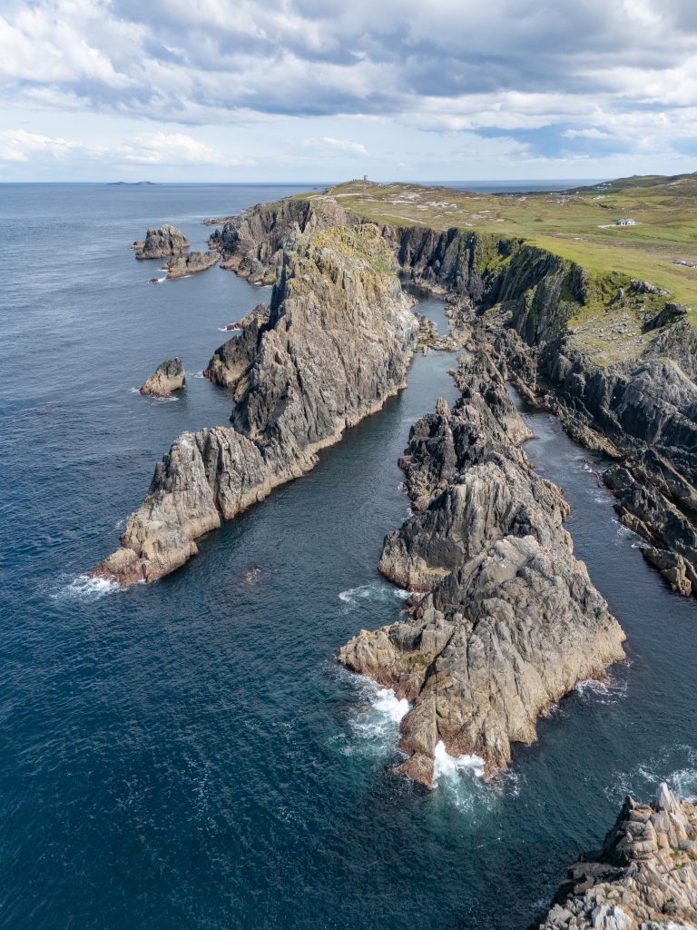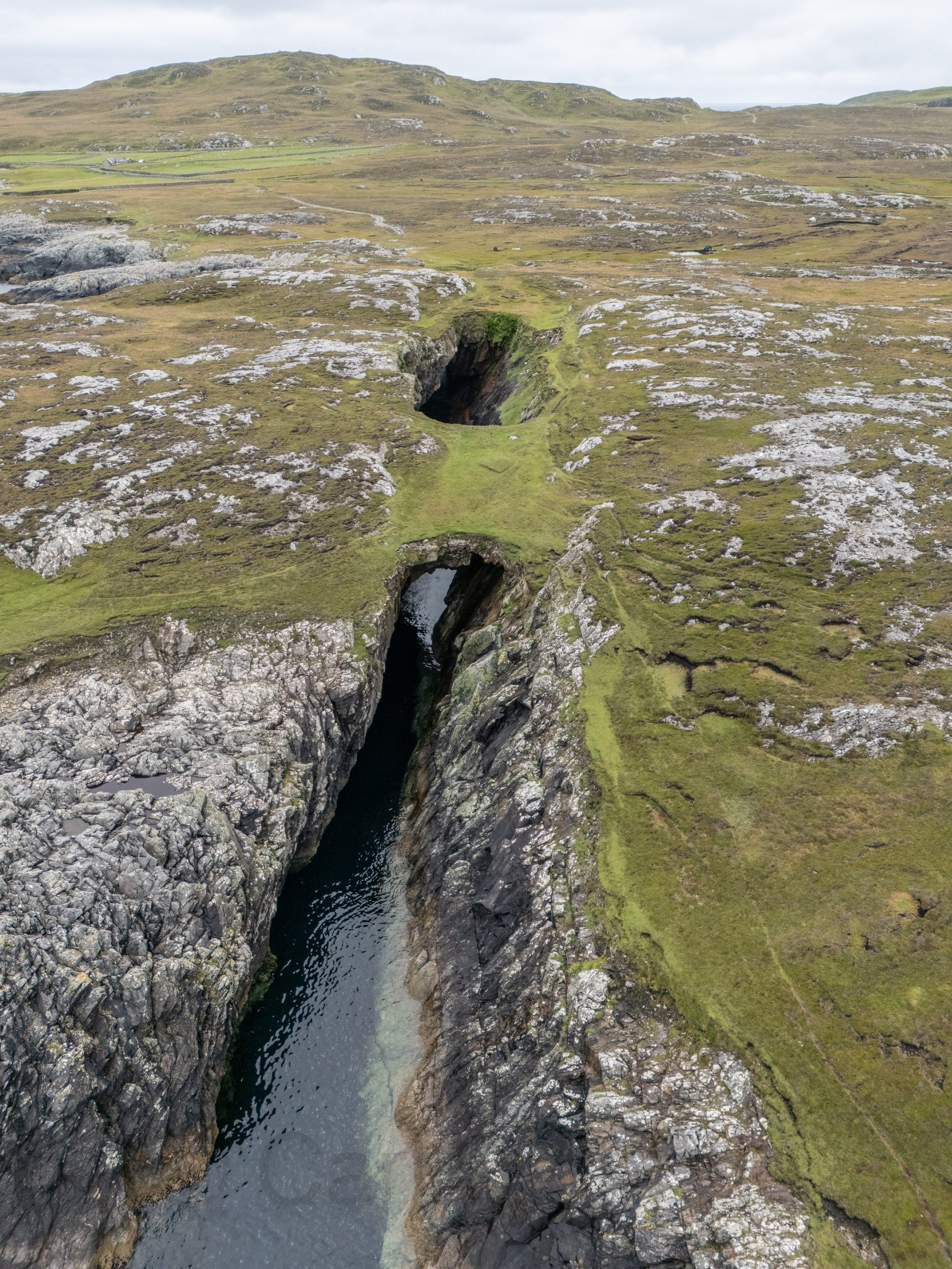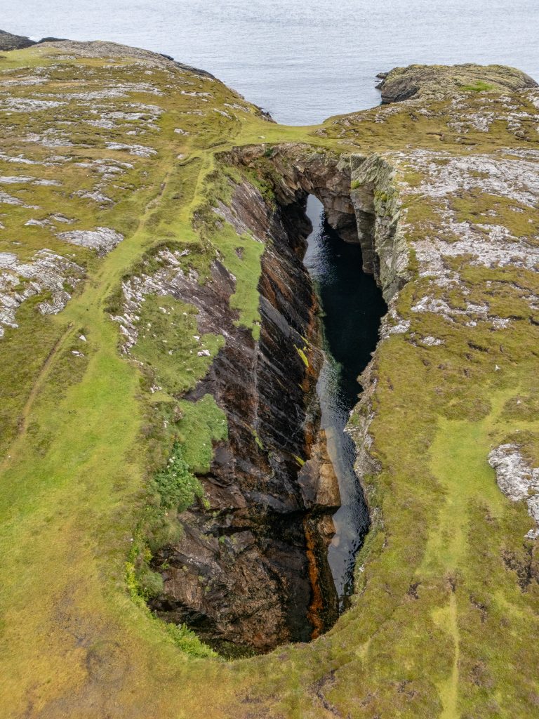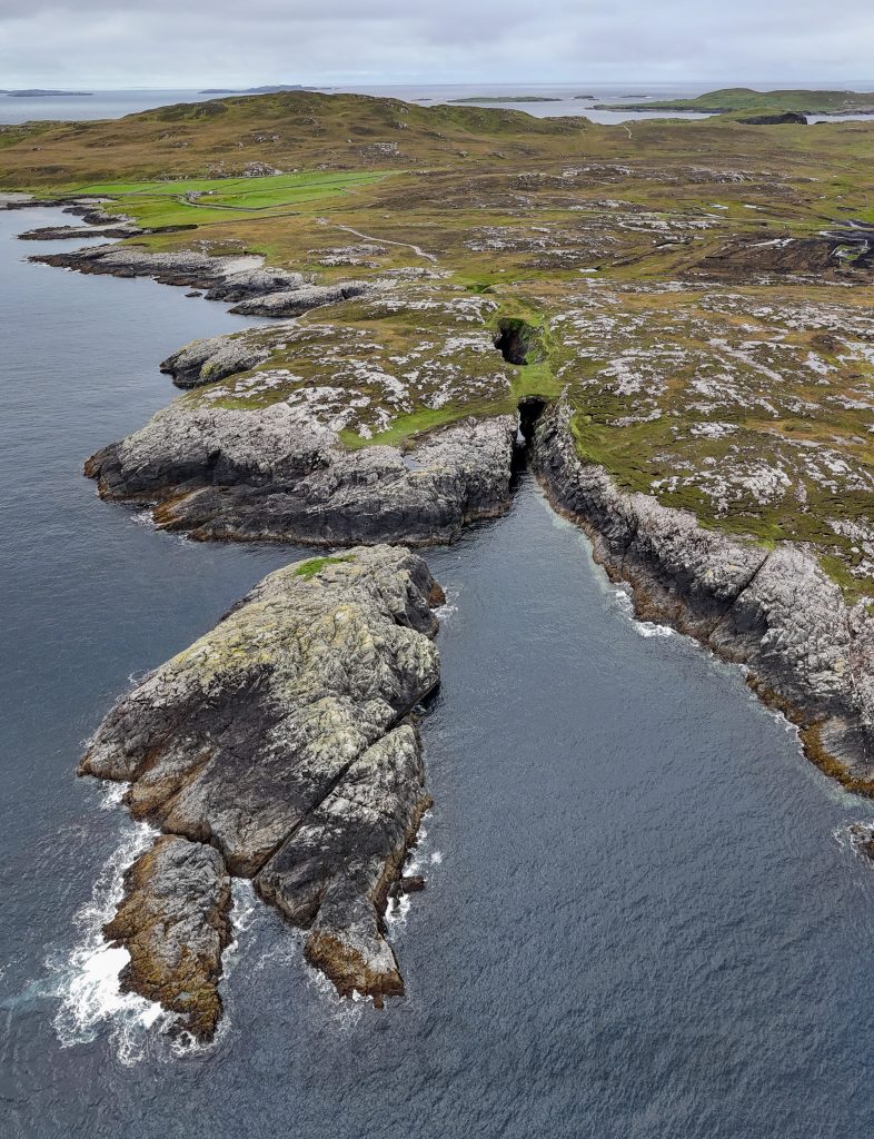 The blow hole on Inishbofin was formed when sea caves eroded landwards and upwards into vertical shafts that opened at the surface, allowing seawater to shoot dramatically into the air during certain tidal conditions. I knew the chances of catching the blow hole in action were minimal and was happy to capture the unique geological formation in a progressive series of drone photos, the last of which is a reverse angle.