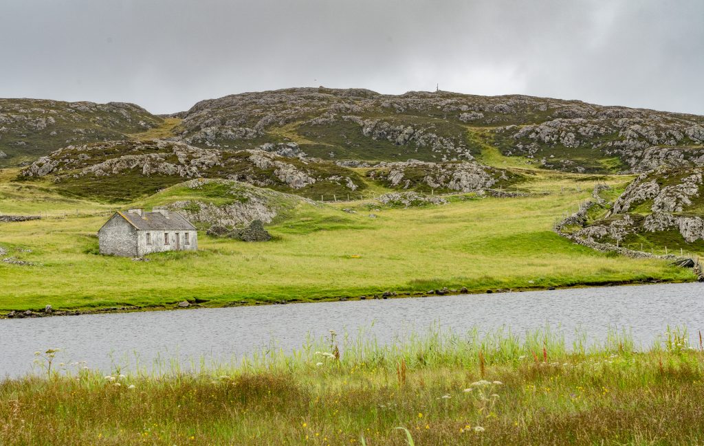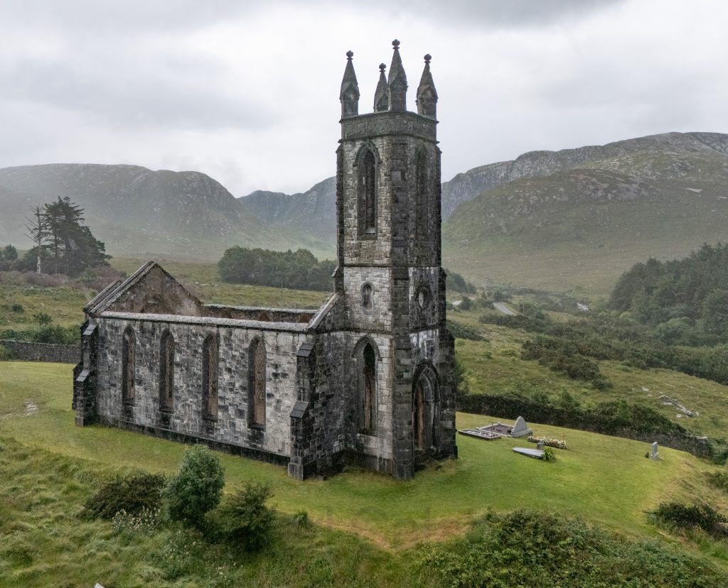 The Old Church of Dunlewey, built in 1853 from white marble and blue quartzite at the foot of Mount Errigal in County Donegal, is a striking and now roofless Gothic-style landmark erected as a memorial by Jane Russell for her husband James, overlooking Dunlewey Lough and renowned for its haunting beauty and rich history. It was our first stop on the way to the dramatic Crohy Head Sea Arch.