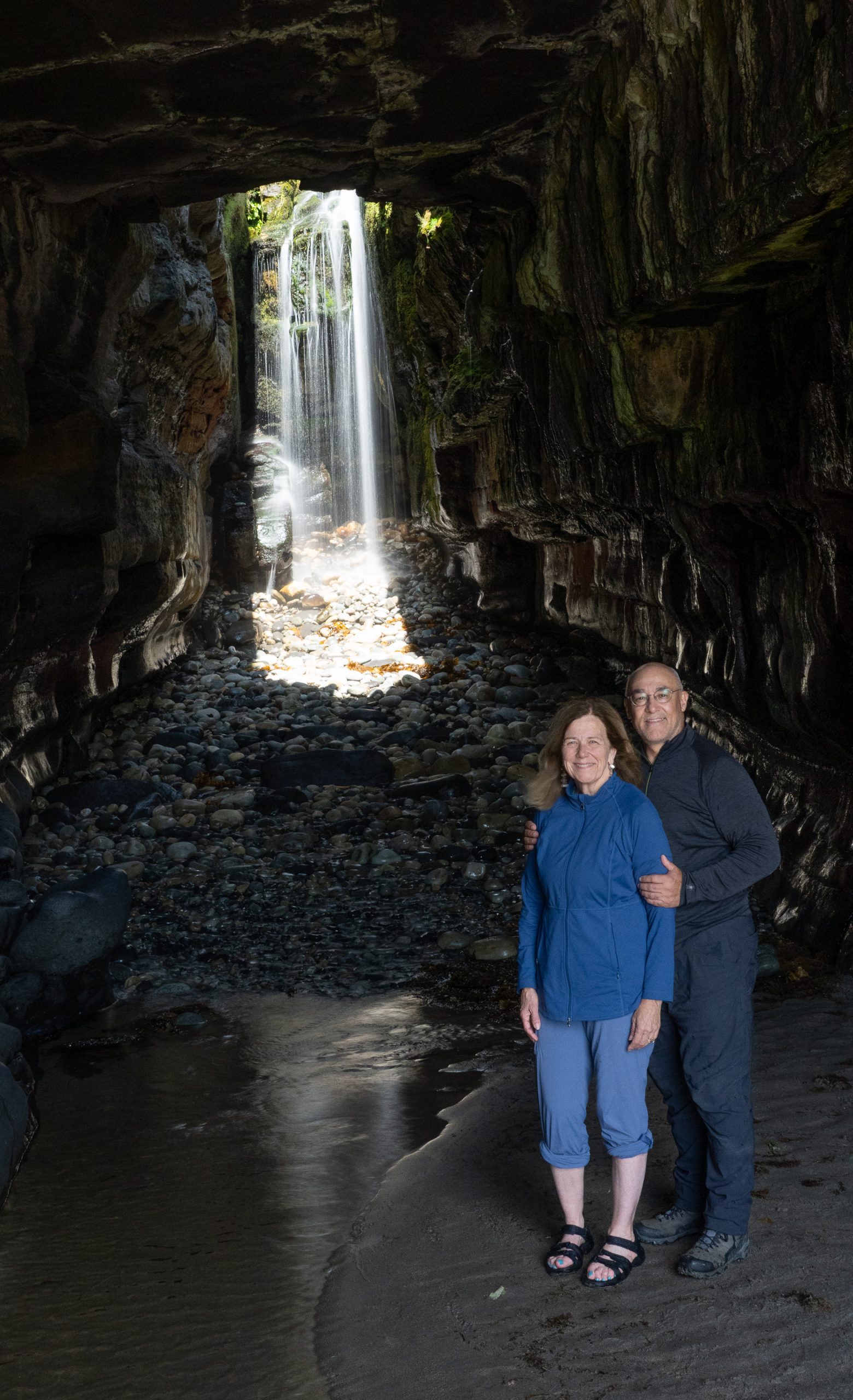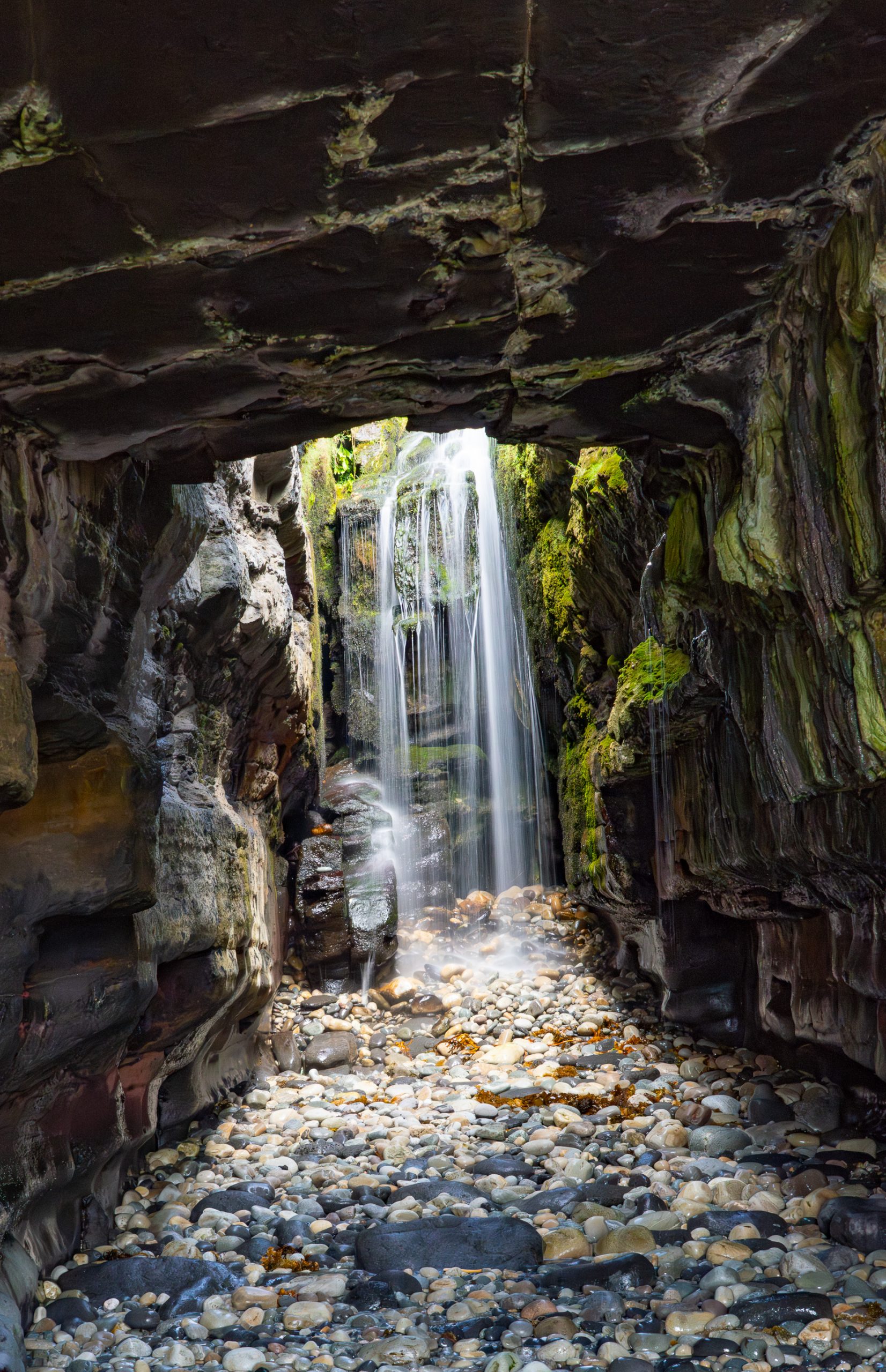 A secret waterfall in a blowhole viewed through a sea cave only accessible at low tide. It doesn’t get better than this.