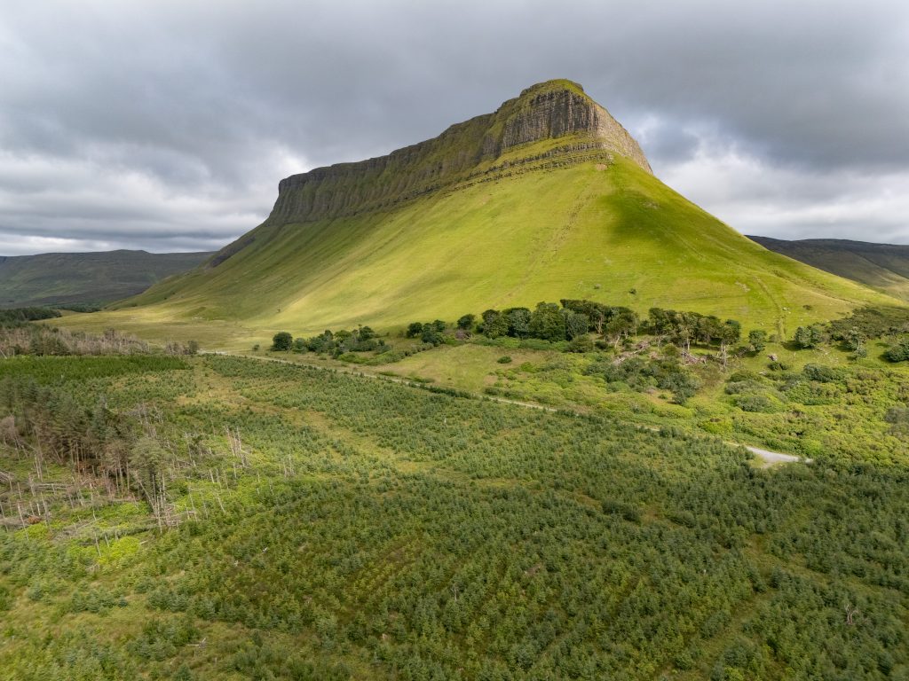 Benbulbin is a dramatic, flat-topped limestone mountain rising 1725 feet, formed by glaciers during the Ice Age and renowned for its unique shape and significance in Irish geology and mythology.