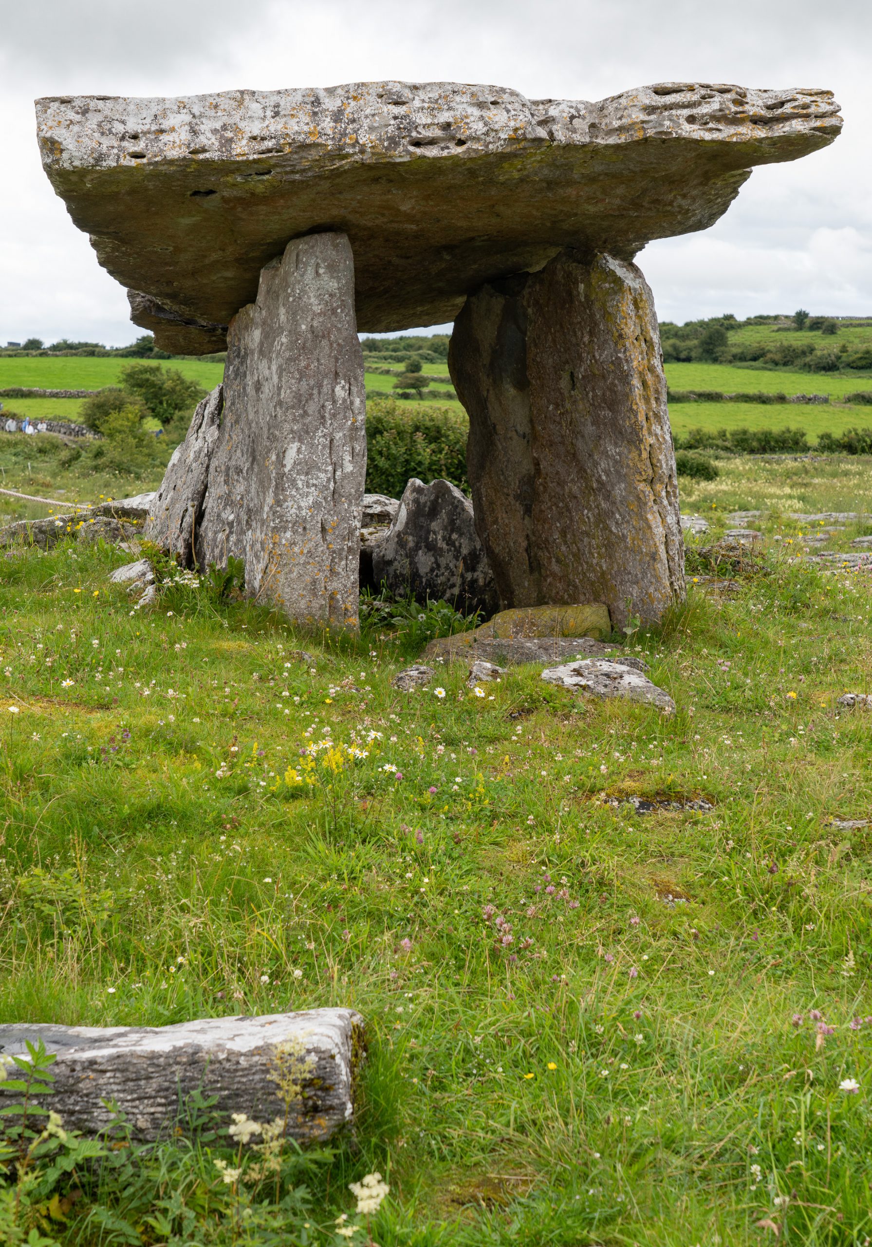 Situated on the high Burren limestone plateau, Poulnabrone Dolmen is one of the country’s most iconic archaeological monuments and the oldest dated megalithic monument in Ireland. It is classified as a portal tomb, featuring two large portal stones standing on either side of an entrance, capped with a massive sloping capstone. Excavations by archaeologists revealed the remains of 33 people at the site and radiocarbon dating of their bones indicates that the tomb was in continual use for a period of 600 years between 5,200 and 5,800 years ago.