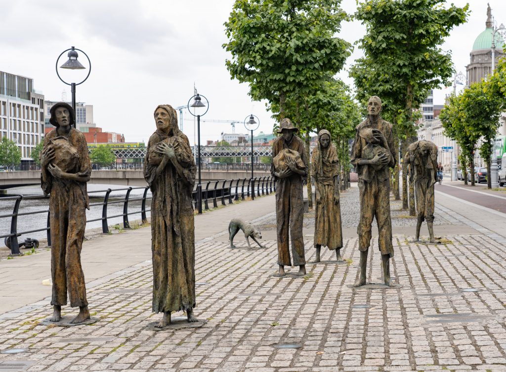 Our return flight to the US was not until late afternoon, allowing Jeanine and me another half day to explore Dublin. She opted to visit the Irish Emigration Museum, while I chose to wander around outside. Pictured above is the Famine Memorial, which vividly portrays starving people in rags, some carrying children and meager belongings, symbolizing the suffering faced by the Irish population during the famine when about one million people died and another million emigrated from Ireland. Below, a part of Dublin’s modern skyline is George Quay Plaza.