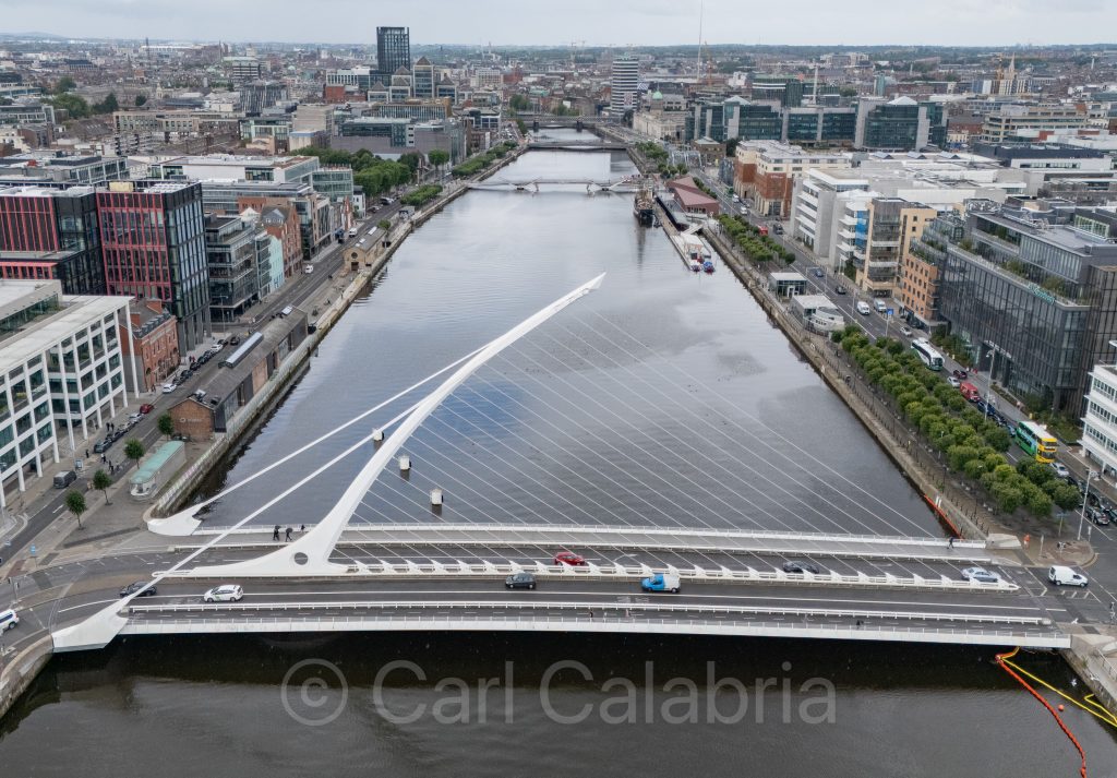 The Samuel Beckett Bridge is a cable-stayed swing bridge that spans the River Liffey. Designed by renowned Spanish architect Santiago Calatrava, the bridge is noted for its elegant shape that evokes an Irish harp lying on its edge, symbolizing Irish culture. The bridge is 120 meters long and 48 meters high, featuring a single curved pylon that rises 46 meters above sea level.