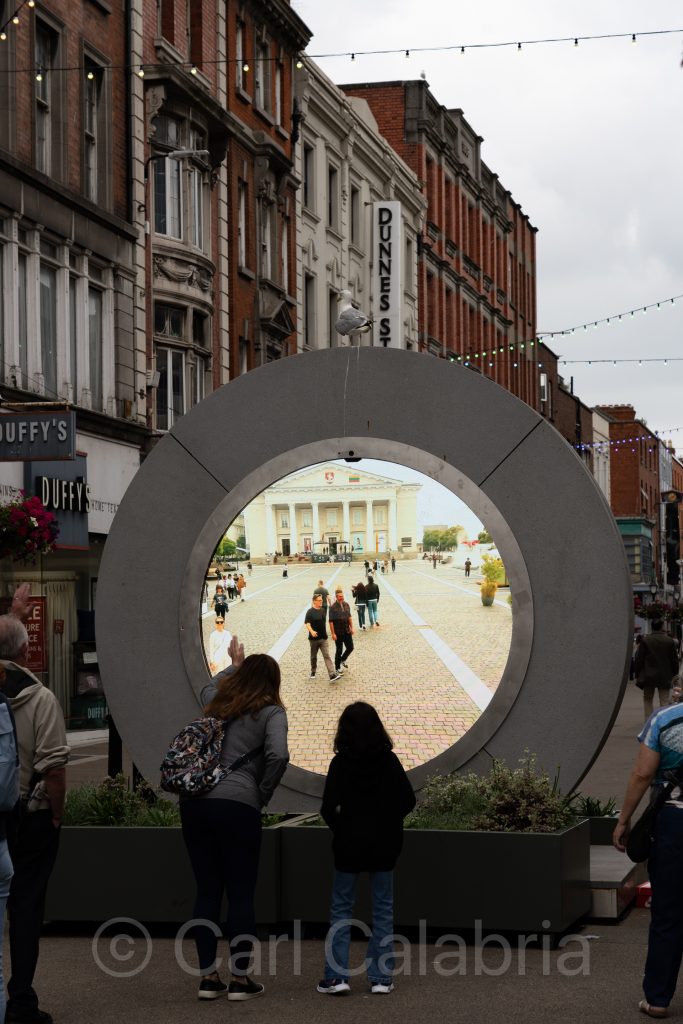 “The Portal” is an innovative public art installation that creates a real-time visual connection between Dublin and other cities worldwide. Initially, the portal was coupled to another portal in New York City and has since expanded to include Vilnius (Lithuania), Poland, and Brazil. It consists of a large circular sculpture with a rounded screen in the middle that streams a continuous, unfiltered live video feed of the other city. This allows people in Dublin to see and interact visually with those in the different cities as if they were sharing the same space.