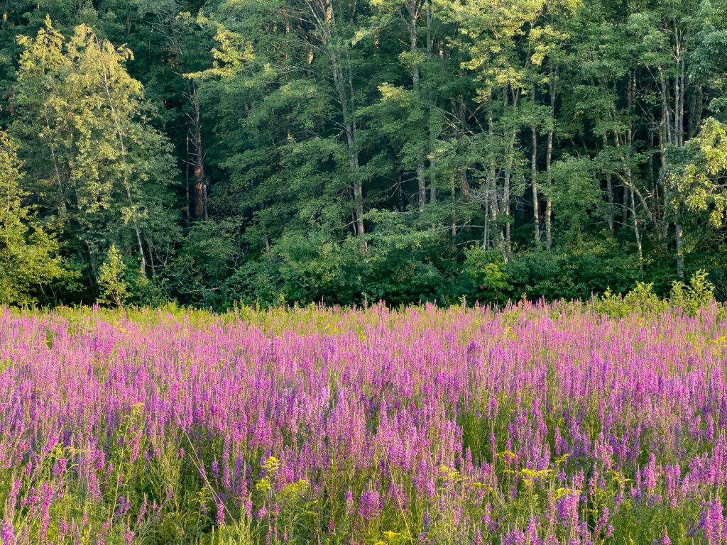 The “butterfly garden” that exists on the common land of our neighborhood has been overtaken by Purple Loosestrife, an invasive plant. While it may not be welcomed, it is certainly delightful to look at.