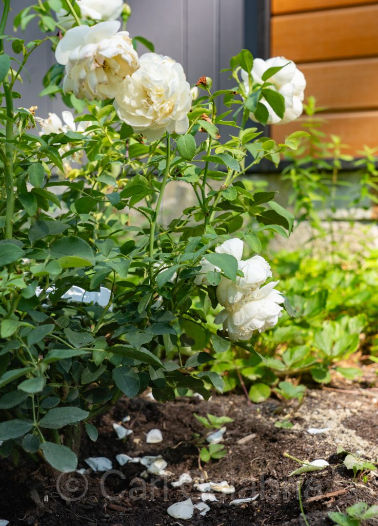 For some time now, Jeanine has been wanting to plant a rose bush beneath our bedroom window. Today, after a trip to a local nursery, we satisfied that dream. Digging a suitable-sized hole (16″W x 16″D) in the highly compacted, rock-strewn soil on which our house was built took the better part of half an hour with the aid of a pickaxe. Jeanine is pictured above scooping out the last bits of clay by hand before adding compost and fertilizer. It remains to be seen how the new rose bush will fare in this setting, and all we can do at this point is continue to water and hope for the best.