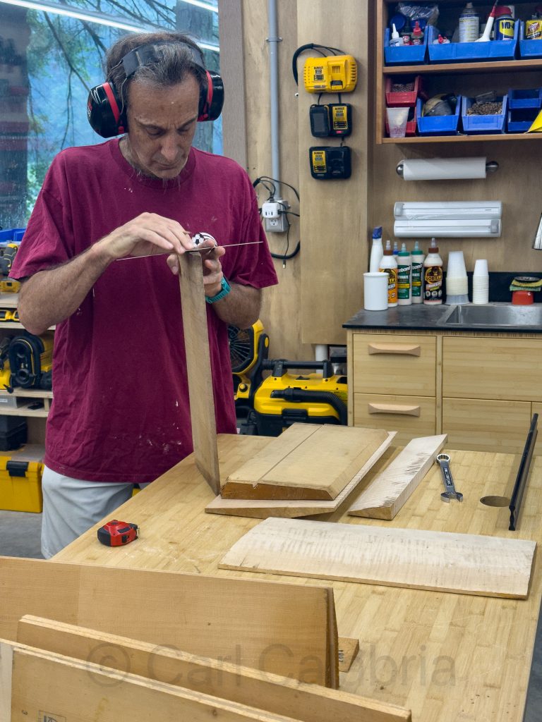 Andy is both a teammate and a friend. He makes, repairs, and sells violins and violas professionally. This morning, he came over to use my bandsaw to cut through several $300 slabs of figured maple and a couple of spruce. Much of the work he does involves hand tools, and although he has a bandsaw, it was not large enough for this particular job. It was fun being in the shop again and working with him. I have taken a fairly long break after spending every day for nine months building the cabinetry for the house.