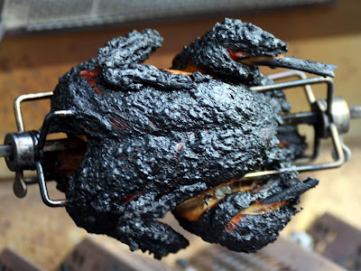 This evening we fired up the new grill for the first time. Jeanine thought it would be nice to have rotisserie chicken. We turned up all the burners and closed the top. This is what we found moments later. Needless to say, future chickens will be cooked on a lower setting. We decided to finish cooking the chicken on low heat and it turned out surprisingly well (once we chiseled away the skin). When Jeanine and I moved into our first home together, she planned to treat our moving crew (several of our strongest friends)to a turkey dinner. Most people would simply order a couple of pizzas; not my Jeanine. She covered the turkey in a cheese cloth which came into contact with the heating element and caught on fire. First hours in the house and we almost burned it down. I have come to regard these roasting disasters on new equipment as something of an initiation which is guaranteed to produce a subsequent lifetime of delicious food.
