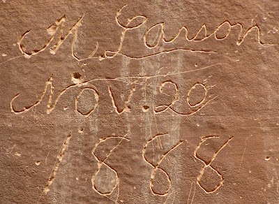 Prospectors and other travelers passing through the Capitol Gorge in the late 1800s left their names on a wall of rock that came to be known as the Pioneer Register. This is but one of several dozens of inscriptions that appear on the very distinctive wall.