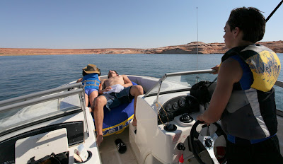 For a big change of pace we rent a 19 foot power boat and set out on Lake Powell which features a shoreline that is longer than the entire west coast of the USA.