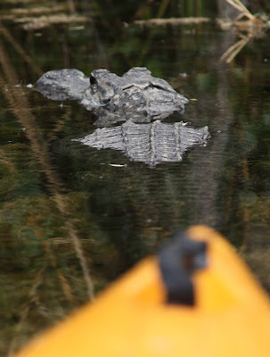 When I reached my original put in point I continued upstream where I found two lagoons and much more wildlife. I wanted to get a photograph of an alligator from short range and found the best way to get close was to glide up from behind them. When I took this photo the tip of my kayak was over its tail and I was still moving forward. After getting the shot I quickly reversed and once I reached a safe distance also resumed breathing. The alligator was aware of my presence but did not perceive a threat or opportunity and just remained still. I considered paddling along side of it for a full length shot but decided not to push my luck and to heed the requests of my children to not get eaten.