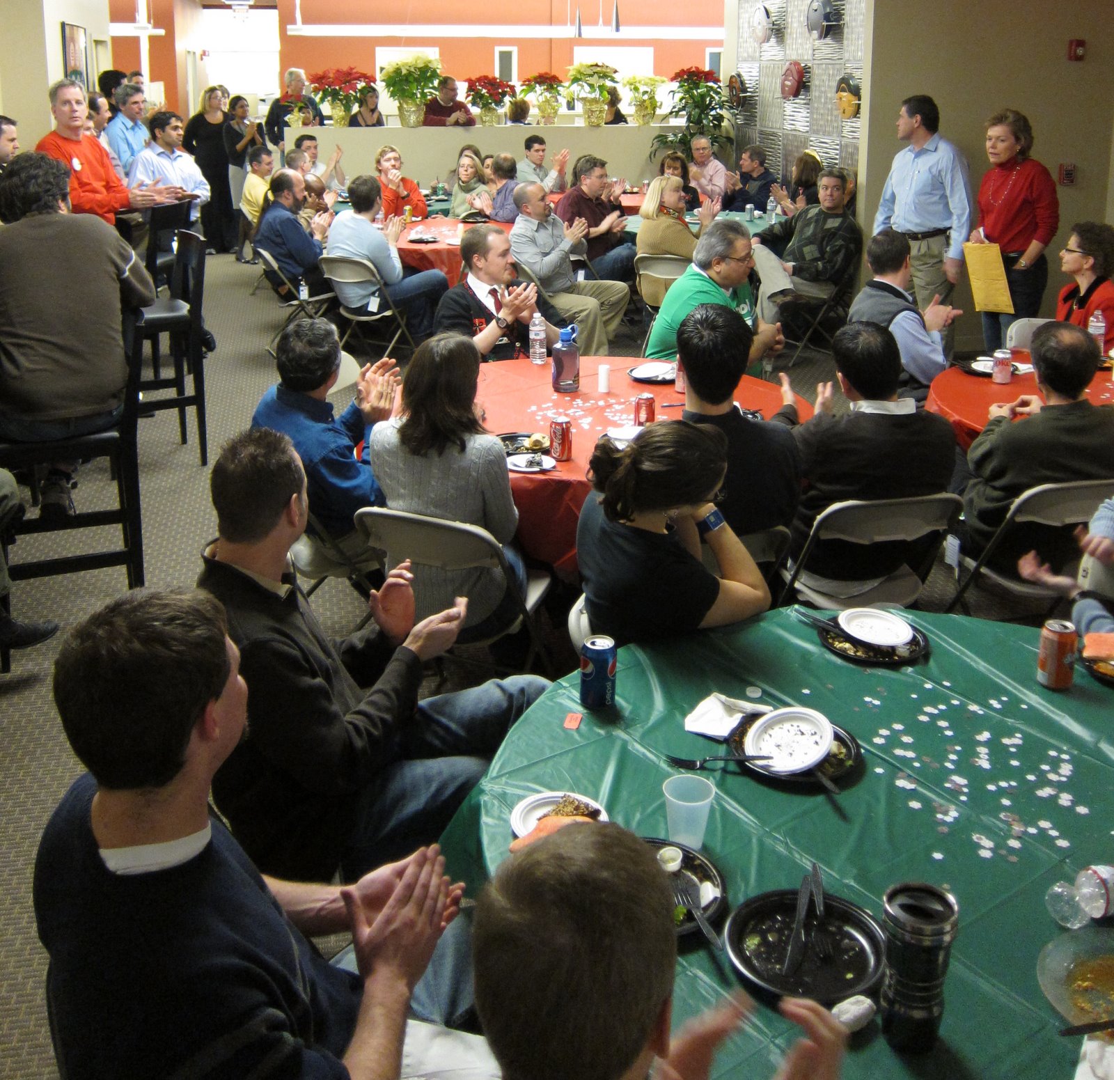 Recognizing outstanding financial performance last year, the Home Robots division of iRobot celebrated with a catered lunch and gift raffle. This was but a warm-up for the annual holiday party which is held in late January. Every employee also received a very nice soft shell jacket with the company logo.