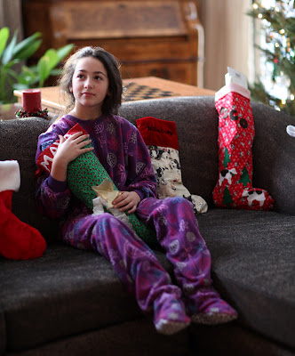 Pajama Princess December 25, 2010 Carl We did stockings in reverse order this year (oldest to youngest). Maya waits patiently for her turn dressed in her new footed pajamas.
