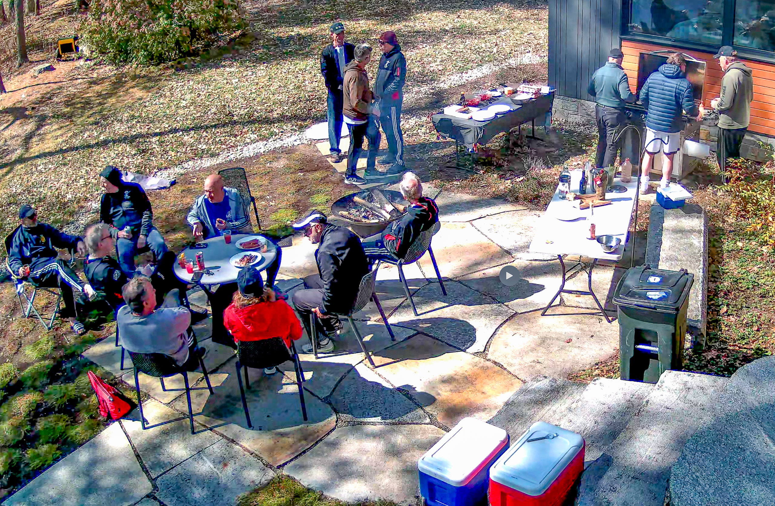 It is the custom on my soccer team to follow every match with an aprés at one of our houses or a restaurant if we are playing an away game. I volunteered to host today’s gathering and decided to try something new. Since we had an early game (8 am), I thought it would be fun to do breakfast food on the griddle rather than the customary burgers and beer. We had pancakes, breakfast sausage, bacon, eggs, and hash browns. Thankfully, one of my teammates offered to help me man the grill, allowing us to keep pace with demand. In addition to the cooked food, we had homemade bread baked by one of our players, and macerated strawberries to top the pancakes. I didn’t have time to get a photo, so I pulled this one from our security system.