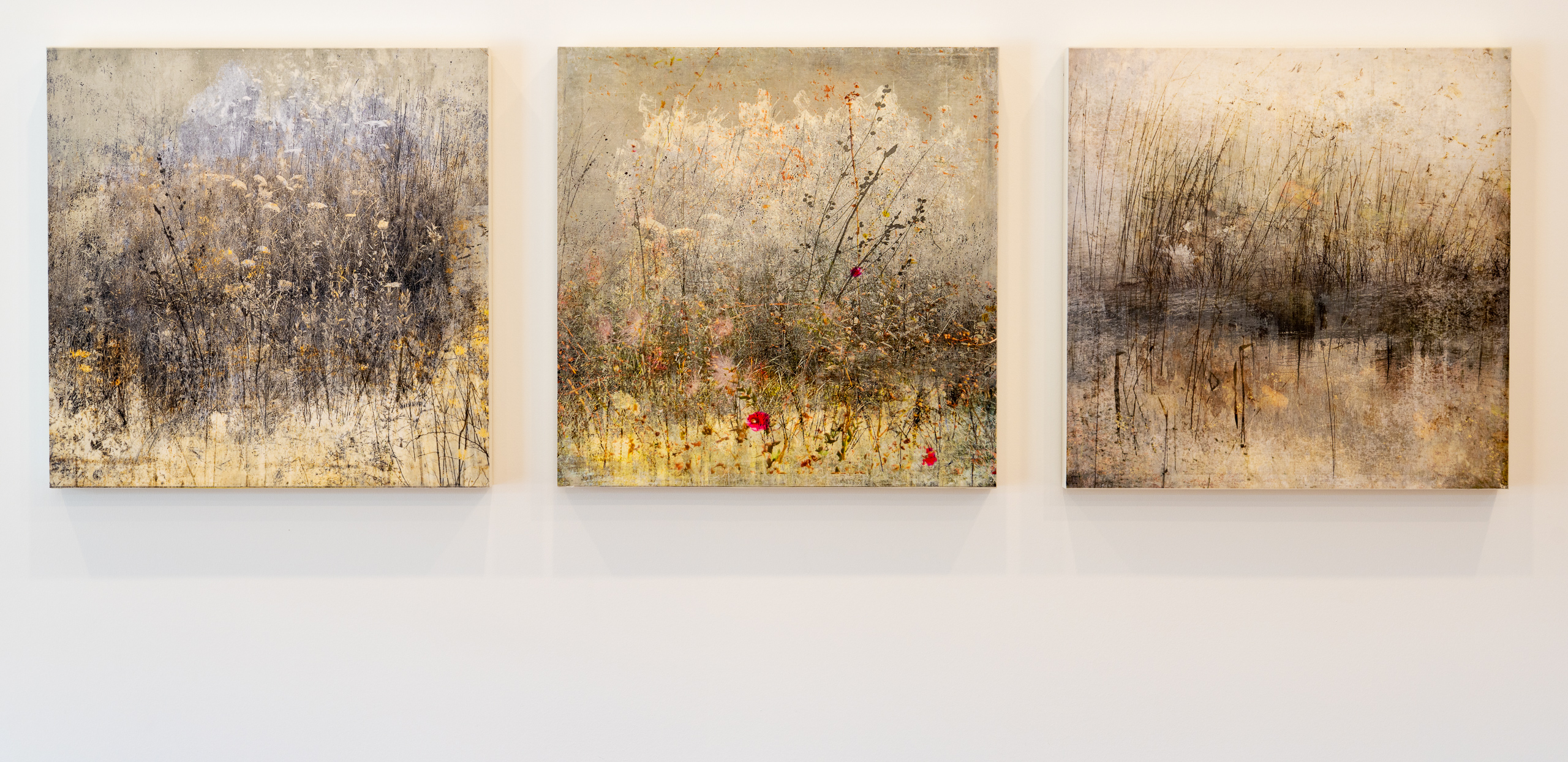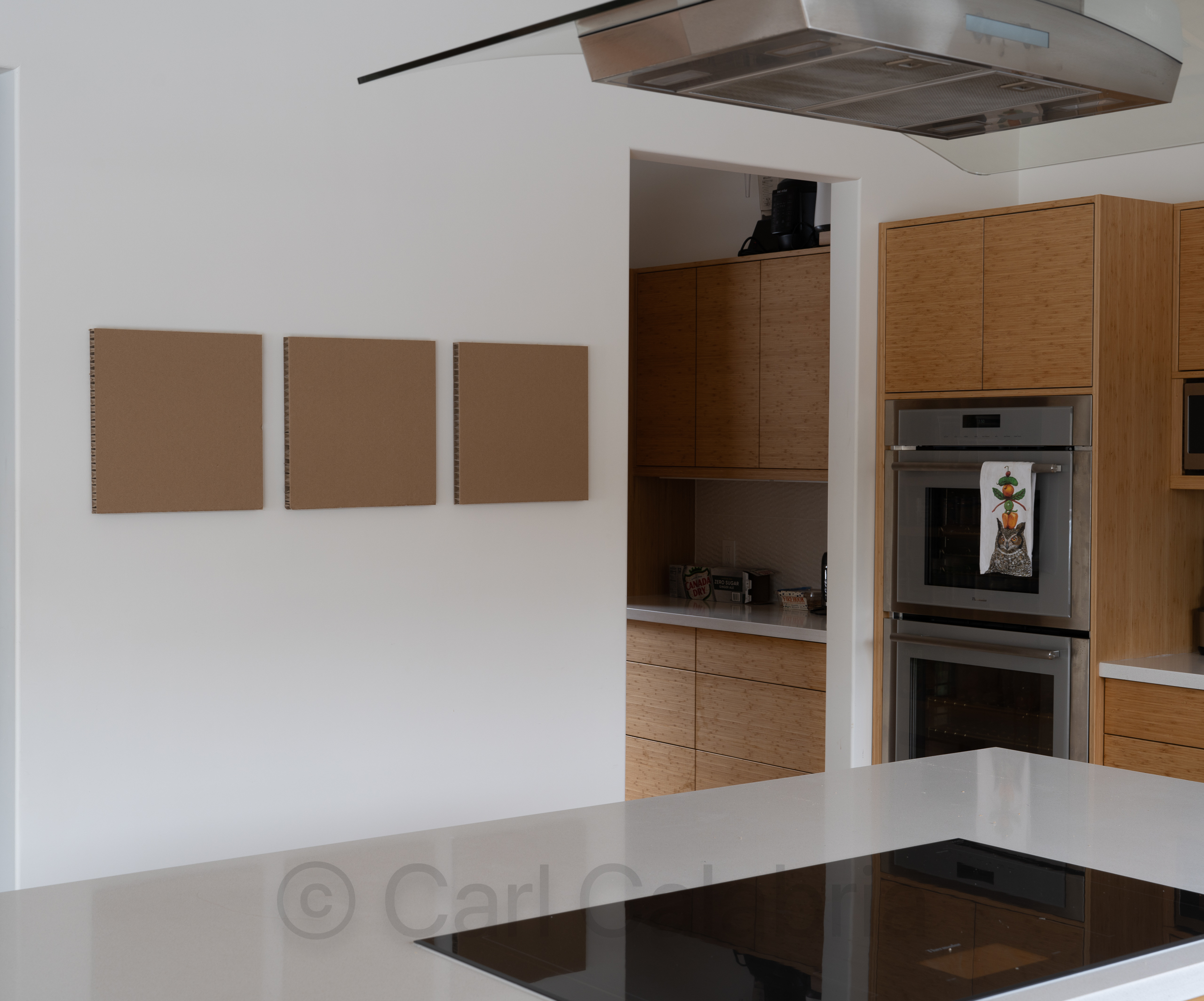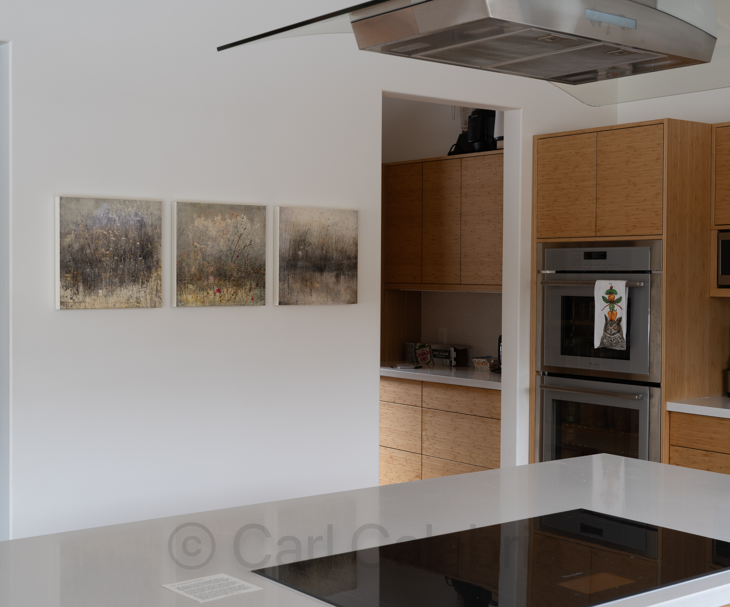 Ever since we completed the River House, Jeanine and I have struggled to select artwork that we can both agree on. Today, Jeanine suggested we get out of the house for an adventure, and I reluctantly agreed to visit several local art galleries. When we entered the Three Stones Gallery in downtown Concord, we were both immediately drawn to the works of local artist Joan Kocak. Kocak creates her art using encaustic photography, a process in which layers of beeswax and resin are fused onto a photographic image with a blowtorch, creating both texture and a durable seal. The scenes in the collection we purchased are from the Great Brook State Park, located one town over in Carlisle. Before mounting them in our kitchen, I used cardboard stand-ins to refine placement and spacing.